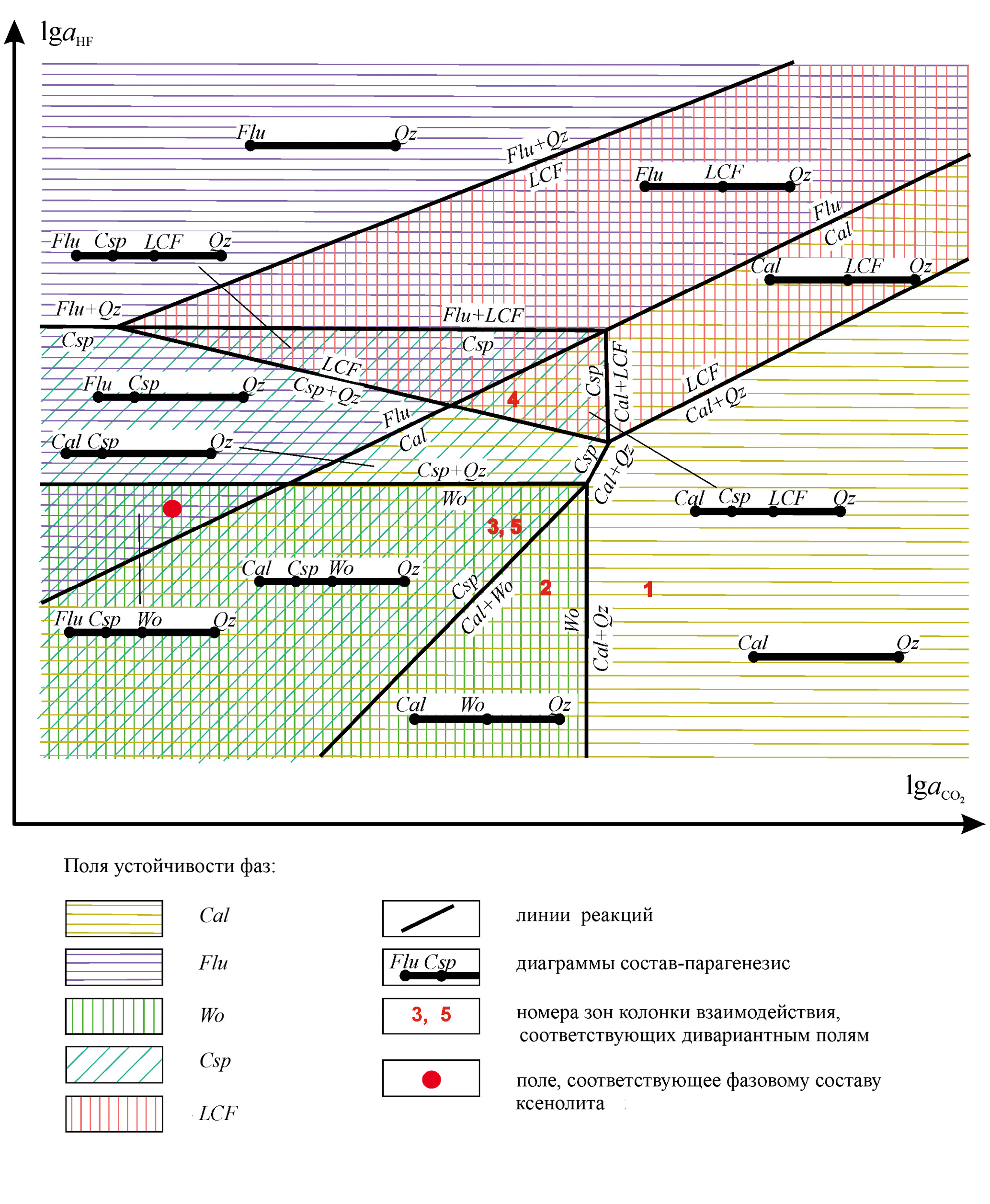 Образование подобных колонок замещения с присутствием высокоплотной жидкости названо нами процессом расплавного замещения и подробно рассмотрено в (Граменицкий и др., 2018) на примерах взаимодействия техногенных расплавов с огнеупорами. При этом образуются реакционные колонки, обладающие основными свойствами диффузионной метасоматической зональности. В отличие от последней в их тыловых зонах наряду с кристаллическими фазами образуется реакционный расплав. Механизм его появления не является ни механическим перемещением воздействующего на кристаллическое вещество расплава, ни плавлением. Расплав образуется как одна из фаз контактово-реакционного взаимодействия и наряду с кристаллическим материалом является частью зональной колонки. Появление карбонатно-фторидного расплава LCF, как и кристаллических фаз колонки, является результатом взаимодействия двух контрастных сред. В соответствии с полученной диаграммой он становится стабильным в условиях высокой активности HF и СO2 (см. рис. 6).