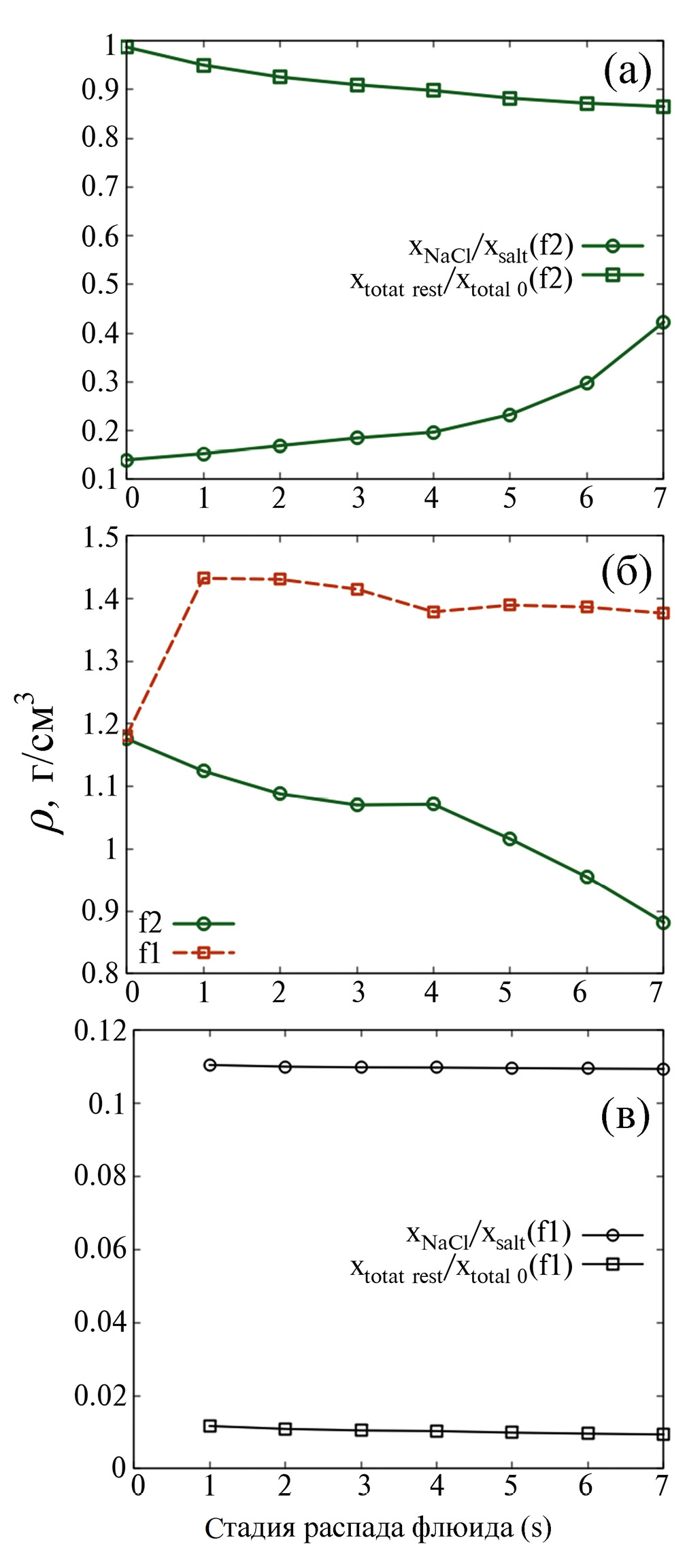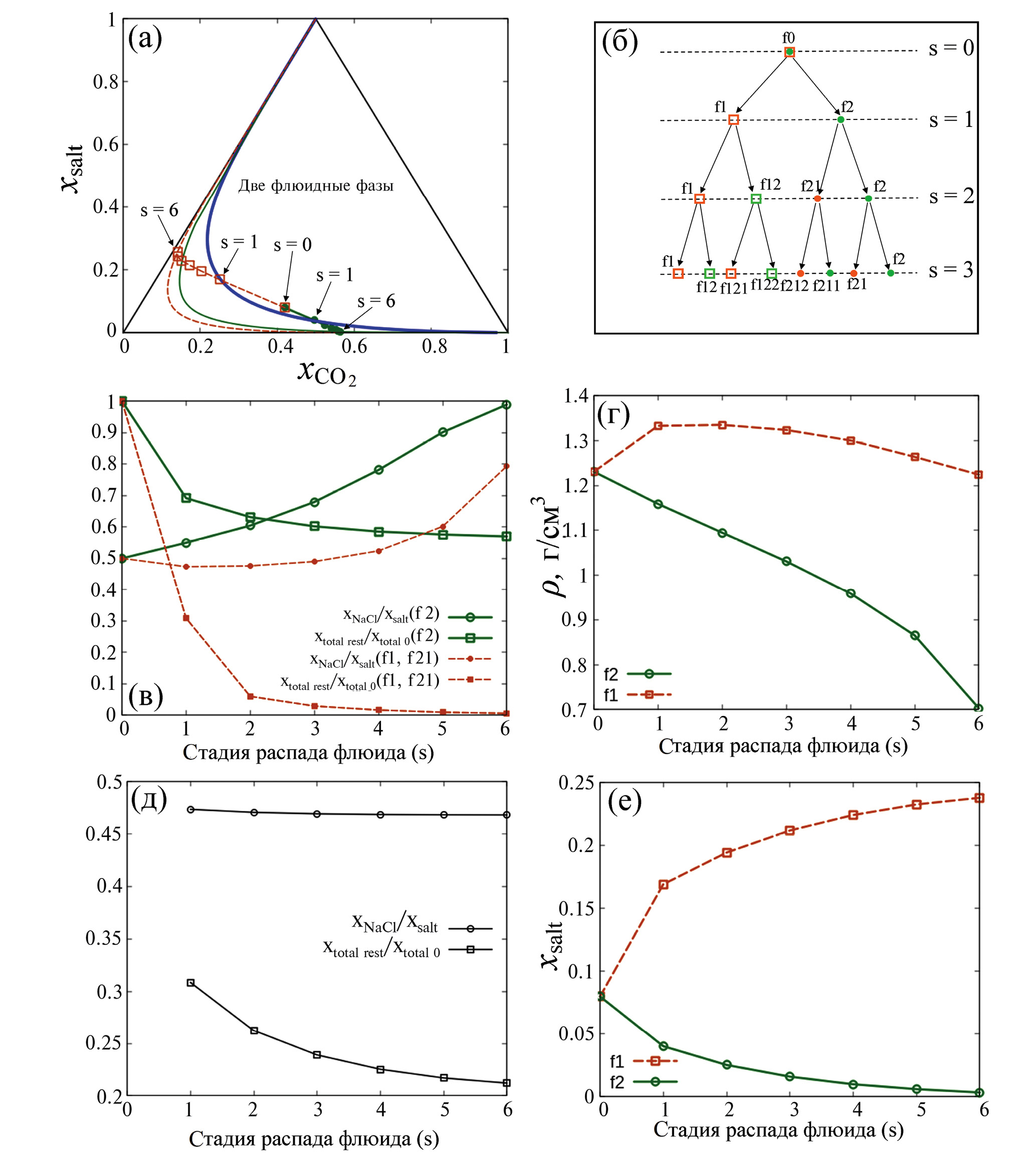 Составы и другие параметры фаз, образованных на стадиях s = 2, …, s = 6, представленные на рис. 2в, 2г, 2е, показывают эволюцию богатой CO2 фазы f2 (s = 1). На этих стадиях от фазы f2 отделяются небольшие количества высокосоленых флюидов с высоким содержанием CaCl2. Так, в точке s = 2 от фазы f2 отделяется высокосоленая фаза f21 с суммарной мольной долей компонентов 0.046 от суммы молей исходных компонентов. В точке s = 3 отделяющаяся высокосоленая фаза имеет суммарную мольную долю 0.023 от исходного флюида, и так далее, рис. 2в. В ходе этих последовательных расслоений солевая часть собственно фазы f2 эволюционирует в направлении чистой соли NaCl. После стадии сепарации s = 6 xNaCl составляет 99% от полной мольной доли соли в фазе f2. Помимо собственно фазы f2, относительное содержание NaCl по сравнению с первичным флюидом может значительно возрастать в отделяющихся от нее водно-солевых фазах f21. В нашем примере (рис. 2в) доля NaCl в фазах f21 возрастает с rNaCl = 0.5 до rNaCl = 0.8.