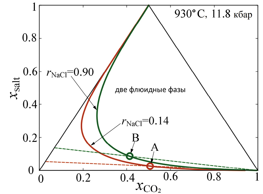 Методом микротермометрии во флюидных включениях были определены мольные доли солей в водной части расслоенного флюида, содержащегося во включениях (Бушмин и др., 2020), т. е. величины xNaCl/(xH2O + xsalt), и xCaCl2/(xH2O + xsalt). Помимо водно-солевой фазы большинство из этих включений содержит некоторое, не определенное в измерениях, количество CO2. В качестве примера составов мы рассмотрим два включения, которые будут обозначены как A и B. Для включения A мольная доля NaCl в общем составе соли rNaCl = 0.14 и степень солености водно-солевой части флюида sH2O = xsalt/(xH2O + xsalt) = 0.057. Для включения B rNaCl = 0.91 и sH2O = 0.138. Для определения мольной доли CO2 и, соответственно, мольных долей всех четырех компонентов мы предположили, что гомогенный в момент захвата минералом флюид был одной из фаз более глубинного флюида, расслоенного в исходной точке регрессивного P-T тренда, т. е. при P = 11.8 и T = 930°C. В этом случае точка, соответствующая полному составу флюида, должна лежать на сольвусе, соответствующем температуре и давлению в момент захвата, а также rNaCl захваченной флюидной фазы. В графической форме нахождение полного состава флюидов A и B иллюстрируется фазовой диаграммой на рис. 3. В мольных долях полученные нами составы флюидов A: xH2O = 0.479, xCO2 = 0.492, xNaCl = 0.004, xCaCl2 = 0.025 и B: xH2O = 0.543, xCO2 = = 0.370, xNaCl = 0.079, xCaCl2 = 0.008.