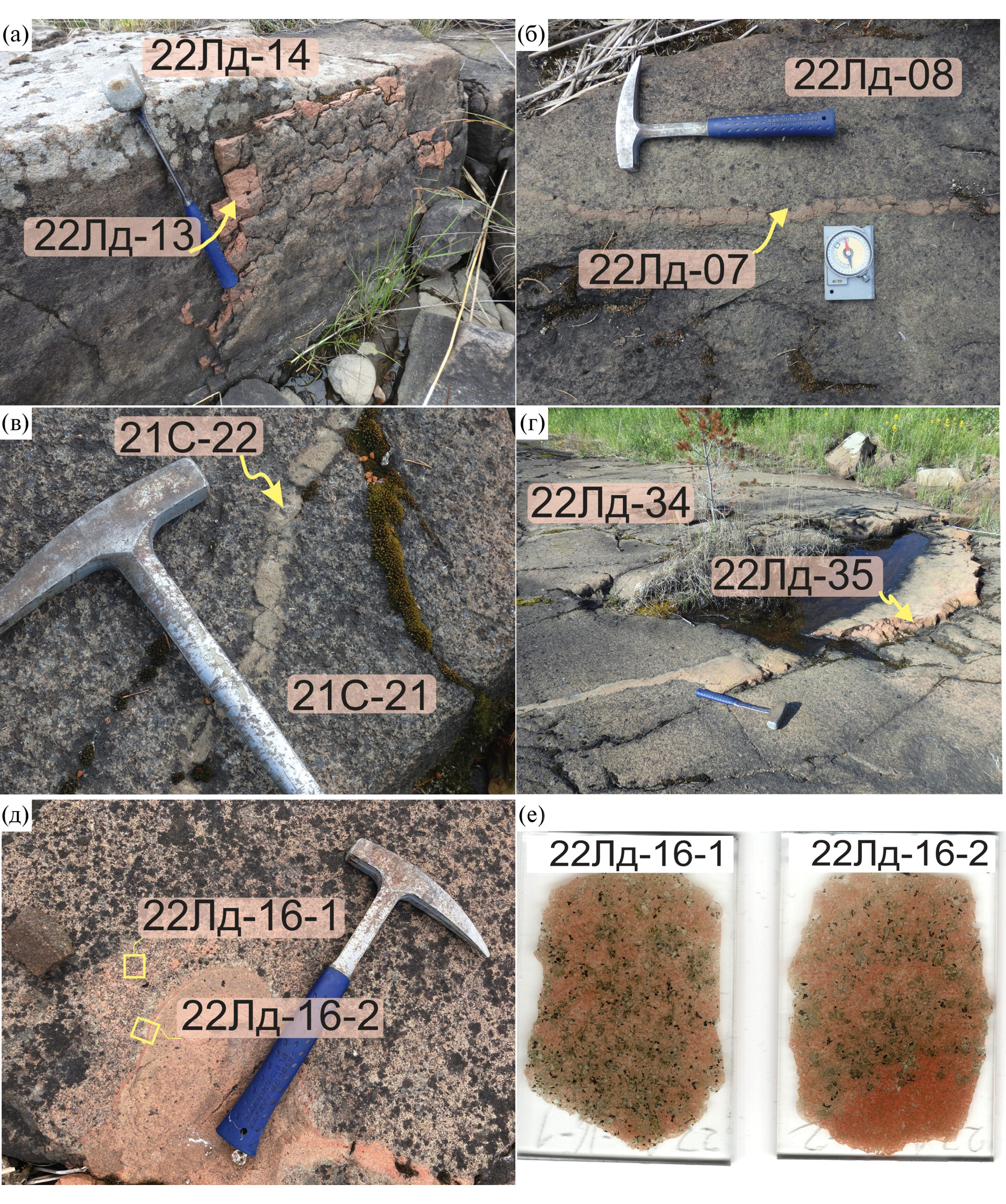 Рис. 2. Жилы графического лейкогранита и кварцевого монцонита в Валаамском силле: (а) и (б) жилы в кварцевом ферромонцогаббро на о-ве Лункулунсаари; (в) жила кварцевого монцонита в феррогаббро в северо-западной части о-ва Валаам; (г) пологая жила лейкогранитов в кварцевом ферромонцогаббро в юго-восточной части о-ва Валаам; (д) трубка графического лейкогранита в кварцевом ферромонцогаббро, о. Лункуунсаари; (е) сканы шлифов в соответствии с местом отбора на рис. 2д.