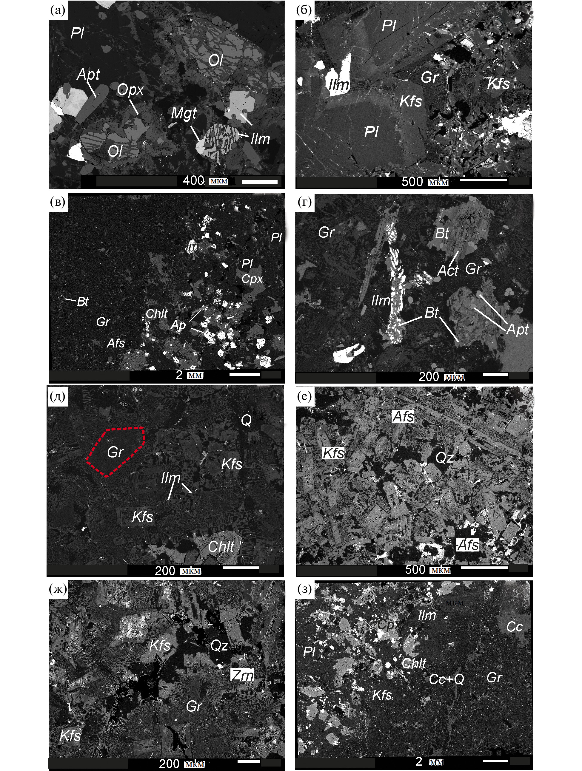 Рис. 3. Фотографии пород Валаамского силла в обратноотраженных электронах (BSE). (а) феррогаббро, на зерна железистого оливина нарастает ортопироксен, хорошо видны симплектитоподобные срастания ильменита и магнетита, а также отдельные зерна магнетита и апатита (обр. 21С-21); (б) кварцевое ферромонцогаббро. Наблюдается нарастание КПШ на зерна плагиоклаза, промежутки между крупными зернами полевых шпатов заполнены гранофировыми срастаниями калиевого полевого шпата и кварца (обр. 22Лд-06); (в) зона контакта между кварцевым феррогаббро (справа) и гранофировой частью образца жильного монцонита (слева). На контакте происходит нарастание КПШ на зерна плагиоклаза и замещение клинопироксена хлоритом и биотитом (обр. 21С-22); (г) контакт между жилой графического лейкогранита и кварцевым феррогаббро. Округлые зерна клинопироксена замещены биотитом и актинолитом, присутствуют симплектито-подобные срастания ильменита с амфиболом, апатит приурочен к ильмениту и замещенным зернам клинопироксена. Промежутки заполнены гранофировым агрегатом (обр. 22Лд-16); (д) графический лейкогранит, зерна полевого шпата полностью или частично замещаются мелкими гранофировыми срастаниями (GR), на которые нарастают более крупные гранофировые сростки, есть сохранившиеся реликты полевого шпата пятнистого облика (обр. 22Лд-06); (е) графический лейкогранит, между лейстами полевого шпата развиваются гранофировые срастания щелочного полевого шпата и кварца, в промежутках между гранофировыми сростками развиваются поздние ксеноморфные массы кварца и биотита (обр. 22Лд-13); (ж) графический лейкогранит, жила, выполненная кварцем и КПШ, плавно переходящая в гранофировые сростки калиевого полевого шпата и кварца (обр. 22Лд-06); (з) зона контакта между графическим лейкогранитом и кварцевым феррогаббро. На контакте между феррогаббро, сложенным срастаниями плагиоклаза и пироксена, происходит нарастание КПШ на плагиоклаз и замещение зерен клинопироксена амфиболом, через гранофир проходит тонкая жила, заполненная кварцем и карбонатом, также в гранофире встречаются полости, заполненные карбонатом (обр. 22Лд-06).