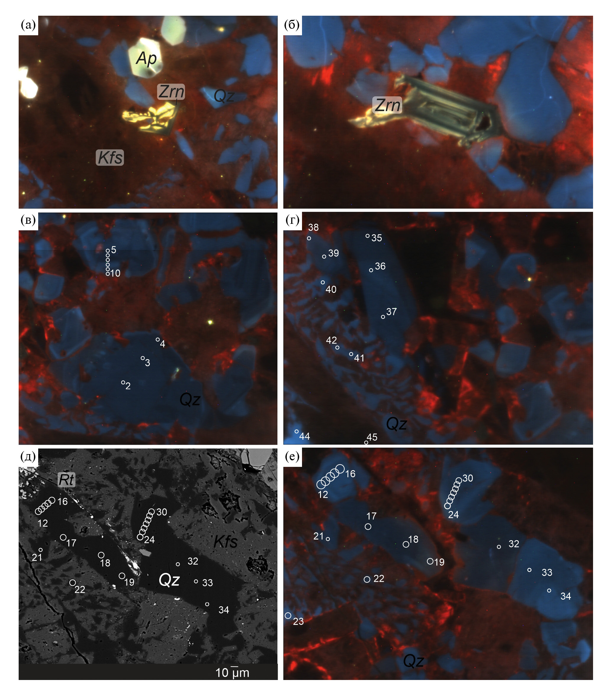 Рис. 4. Микроструктуры выделений циркона (а–б, обр 22Лд-32а) и кварца (в–е, обр. 22Лд-25) в графических лейкогранитах. (а) и (б) – CL изображения, циркон люминесцирует в желтых тонах с темно-серыми прожилками, апатит зеленовато-желтый. (в), (г) и (е) – CL изображения, кварц люминесцирует в голубых тонах, более светлые области имеют более высокие концентрации Ti, в изолированных зернах хорошо выражена ростовая зональность с темными ядрами и светлыми периферийными зонами; щелочной полевой шпат светится в красных тонах. (в) – BSE изображение той же области, что и на (г) в CL лучах. В левом верхнем углу на (д) – светло-серое, на (е) – черное – выделения рутила в срастании с кварцем. Кружки и цифры рядом с ними – точки микрозондового анализа и их номера.