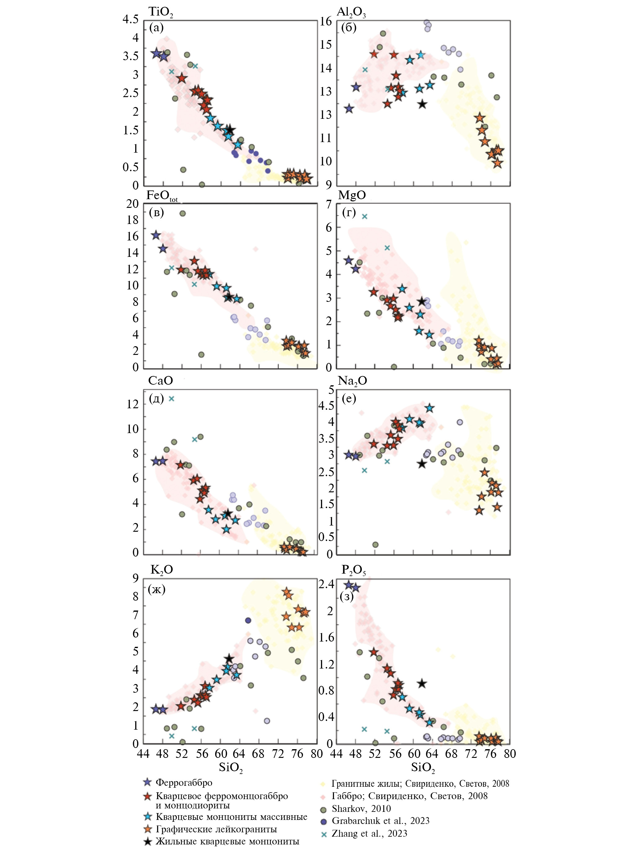 В кварцевых монцонитах массива содержание SiO2 еще более высокое (57.72–63.35 мас. %), но Mg# = 23–34 остается на том же уровне, что у кварцевых ферромонцогаббро и монцодиоритов. Содержания TiO2 и общего Fe2O3 ниже (1.13–1.85 и 9.43–12.77 мас. %, соответственно). Сумма щелочей – 6.86–8.16 мас. % (рис. 5, 6а).