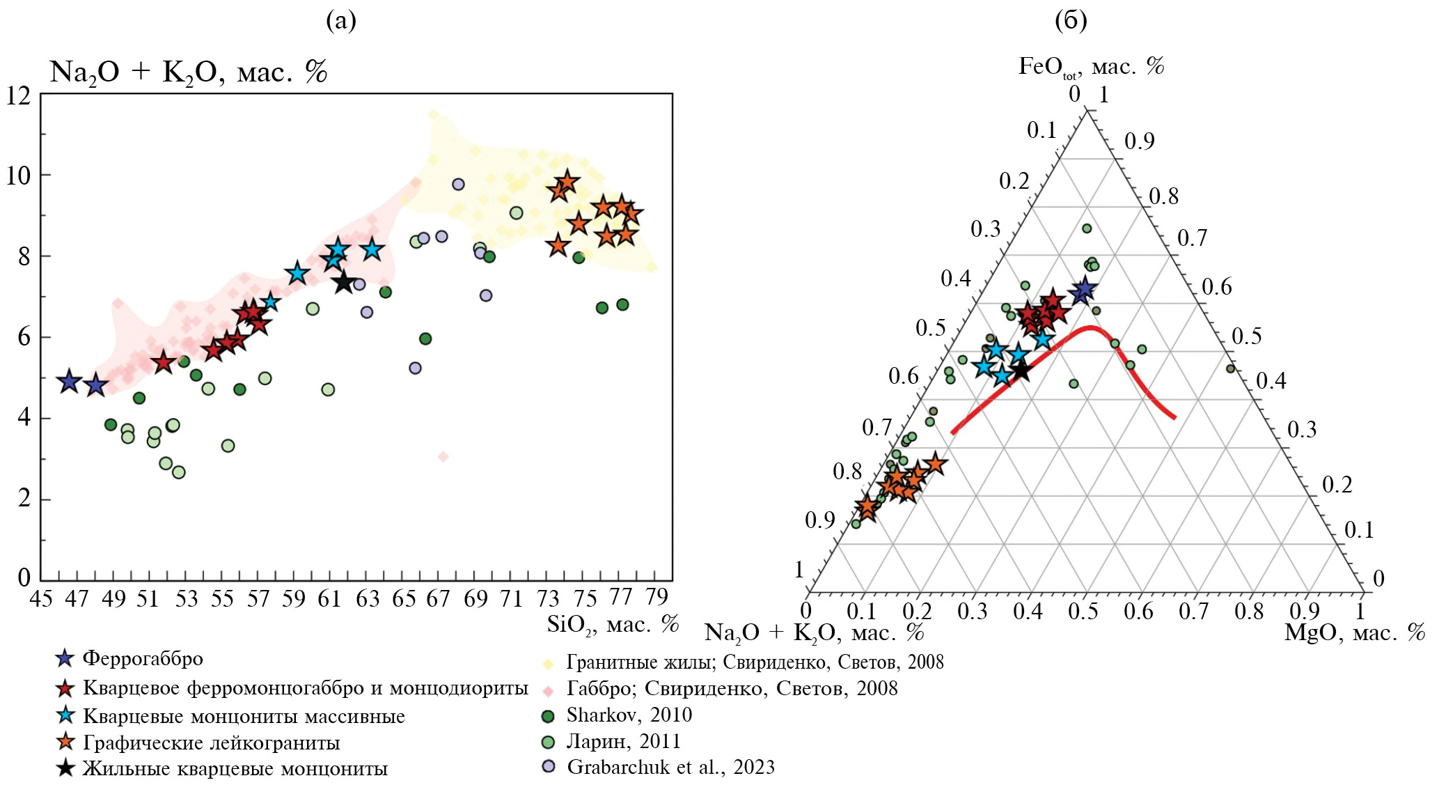 В кварцевых ферромонцогаббро и кварцевых монцодиоритах содержание SiO2 изменяется от 51.80 до 57.10 мас. %, Mg# этих пород ниже, чем у феррогаббро и варьирует от 25 до 33. Содержание TiO2 ниже, чем в феррогаббро (2.09–2.93 мас. %), так же как и общее Fe2O3 (12.60–14.54 мас. %). Сумма щелочей составляет 5.38–6.63 мас. % (рис. 6, 7а).