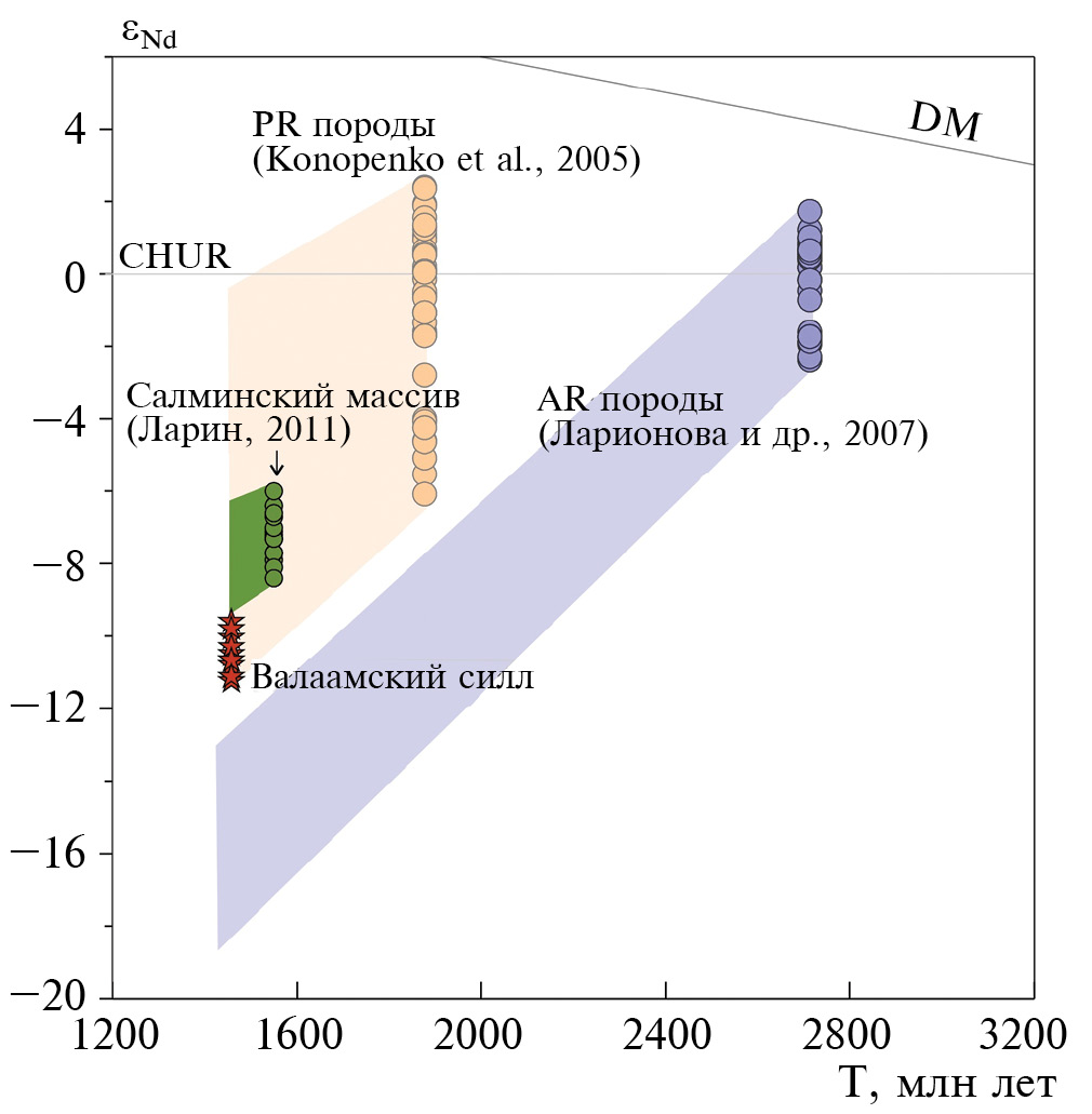 Схожий тренд наблюдается для пород Салминского массива AMCG-типа (Ларин, 2011; Sharkov, 2010), а также пород массива Пиетково AMCG-типа Мазурского комплекса в Польше (Grabarchuk et al., 2023) с возрастом 1495–1491 млн лет, который близок ко времени образования Валаамского силла (рис. 7б).