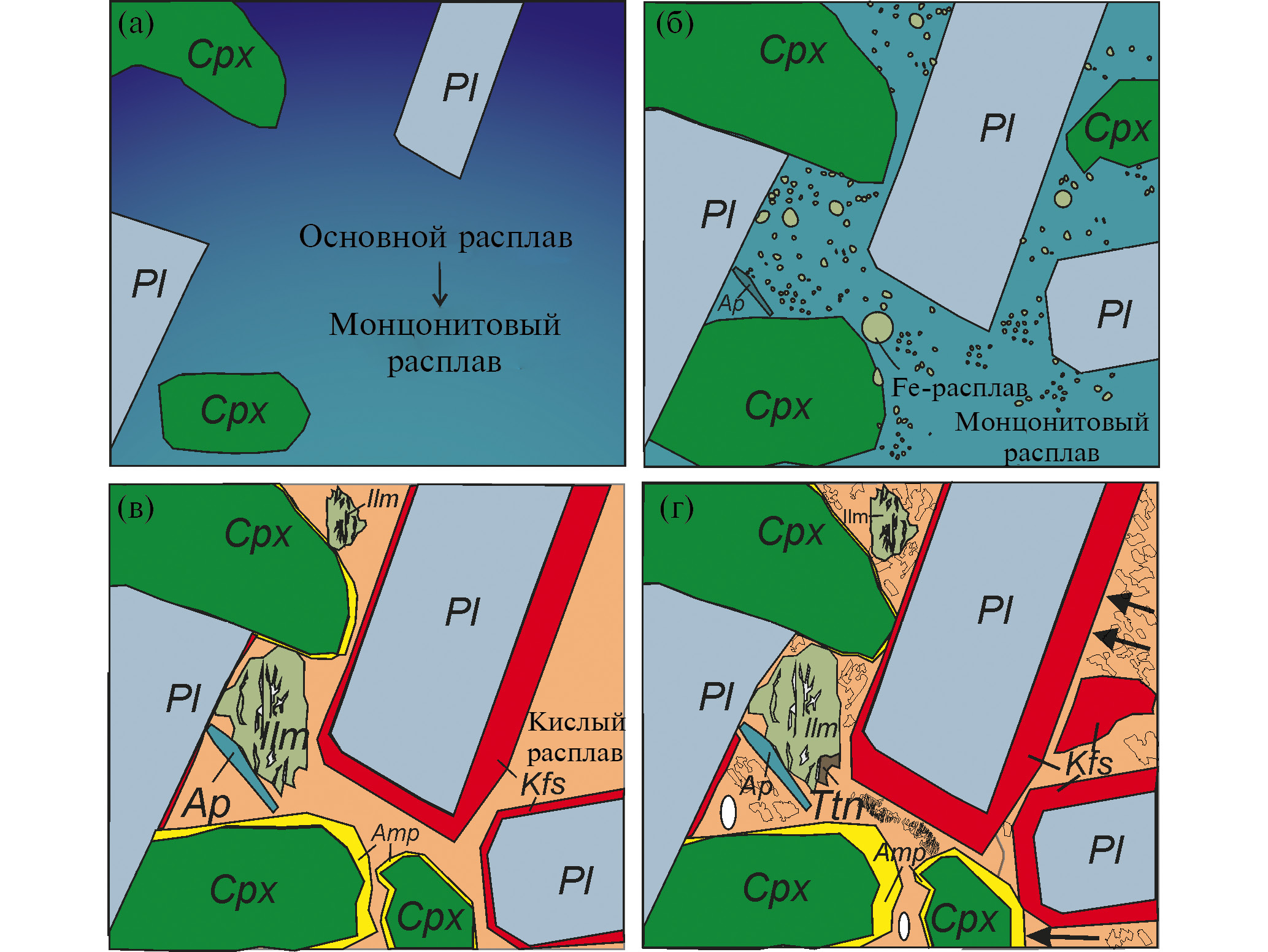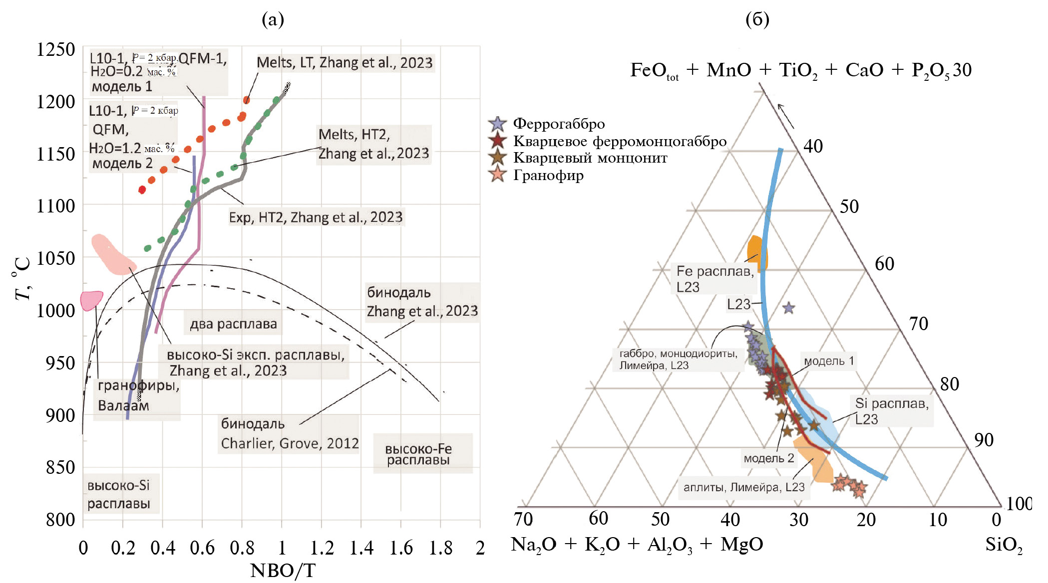 Природа этого позднего отрезка тренда дискуссионная: можно выделить три основные точки зрения на причины появления кислых расплавов в расслоенных интрузивах. Во-первых, многие исследователи полагают, что фракционная кристаллизация исходных базитовых и ферробазитовых магм в закрытой системе может продуцировать кислые остаточные расплавы. Эта точка зрения находит подтверждение как в геологических и петрологических наблюдениях (например, Namur et al., 2010; Skursch et al., 2020), так и в термодинамическом моделировании (например, Vantongeren et al., 2010; Shellnutt et al., 2009). Во-вторых, кислая компонента может представлять коровую выплавку под воздействием тепла базитовых расплавов, что подтверждается Sr, Nd и Pb изотопными данными (например, Troll et al., 2021). Наконец, в последнее время получает все больше подтверждений представление о формировании кислой компоненты за счет несмесимости между высоко-Fe и обогащенными Si расплавами, к которой приводит фракционная кристаллизация базальтового расплава по толеитовому (феннеровскому) тренду. Свидетельство этого механизма образования гранофиров следует как из наблюдений природных и экспериментальных микроструктур в породах расслоенных интрузивов (например, Holness et al., 2011; Honour et al., 2019), геохимии минералов (например, VanTongeren, Mathez, 2012), расплавных включений в минералах (например, Jakobsen et al., 2005), также и из результатов экспериментальных работ, в которых воспроизводится Fe-Si расплавная несмесимость (например, Charlier, Grove, 2012; Zhang et al., 2023; Lino et al., 2023), и термодинамического моделирования (например, Fischer et al., 2016; Lino et al., 2023).
