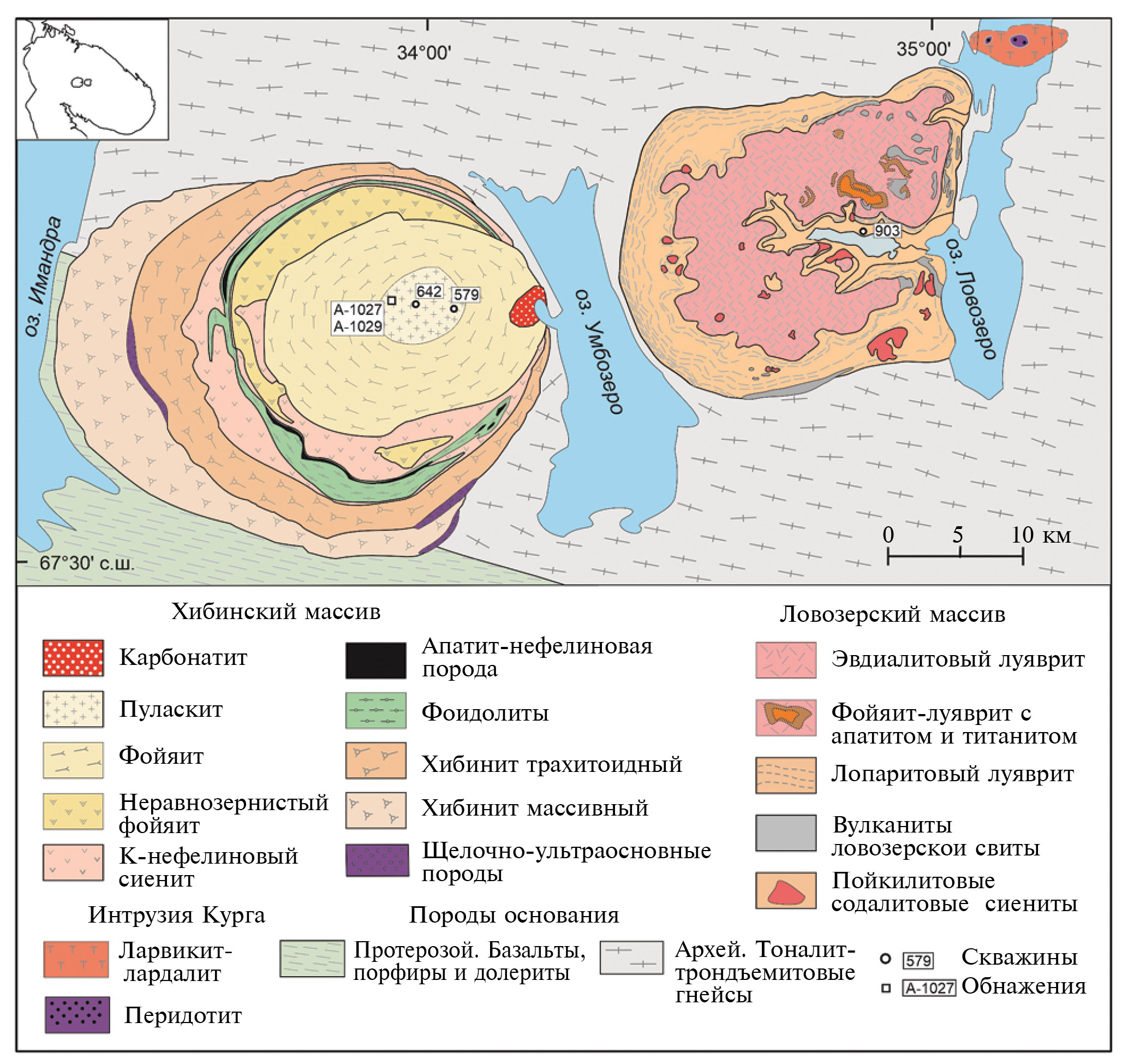 Ловозерский массив. Ранее предполагалось, что установленная по геофизическим данным отрицательная магнитная аномалия в центральной части массива на глубине >1 км отвечает широко распространенным в этом массиве пойкилитовым содалитовым сиенитам (Шаблинский, 1963). Однако скважиной 903, пробуренной (рис. 1) под толщей пород дифференцированного комплекса луявритов-фойяитов-уртитов на глубинах >900 м, были вскрыты цирконсодержащие сиениты – миаскиты. Вертикальная мощность тела, судя по разрезу скважины, составляет не менее 300 м. По латерали тело занимает, по-видимому, значительную часть ядра массива. В отдельных случаях в миаскитах наблюдаются жилы, сложенные породами комплекса луявритов-фойяитов-уртитов, что может указывать на более позднее формирование последних.