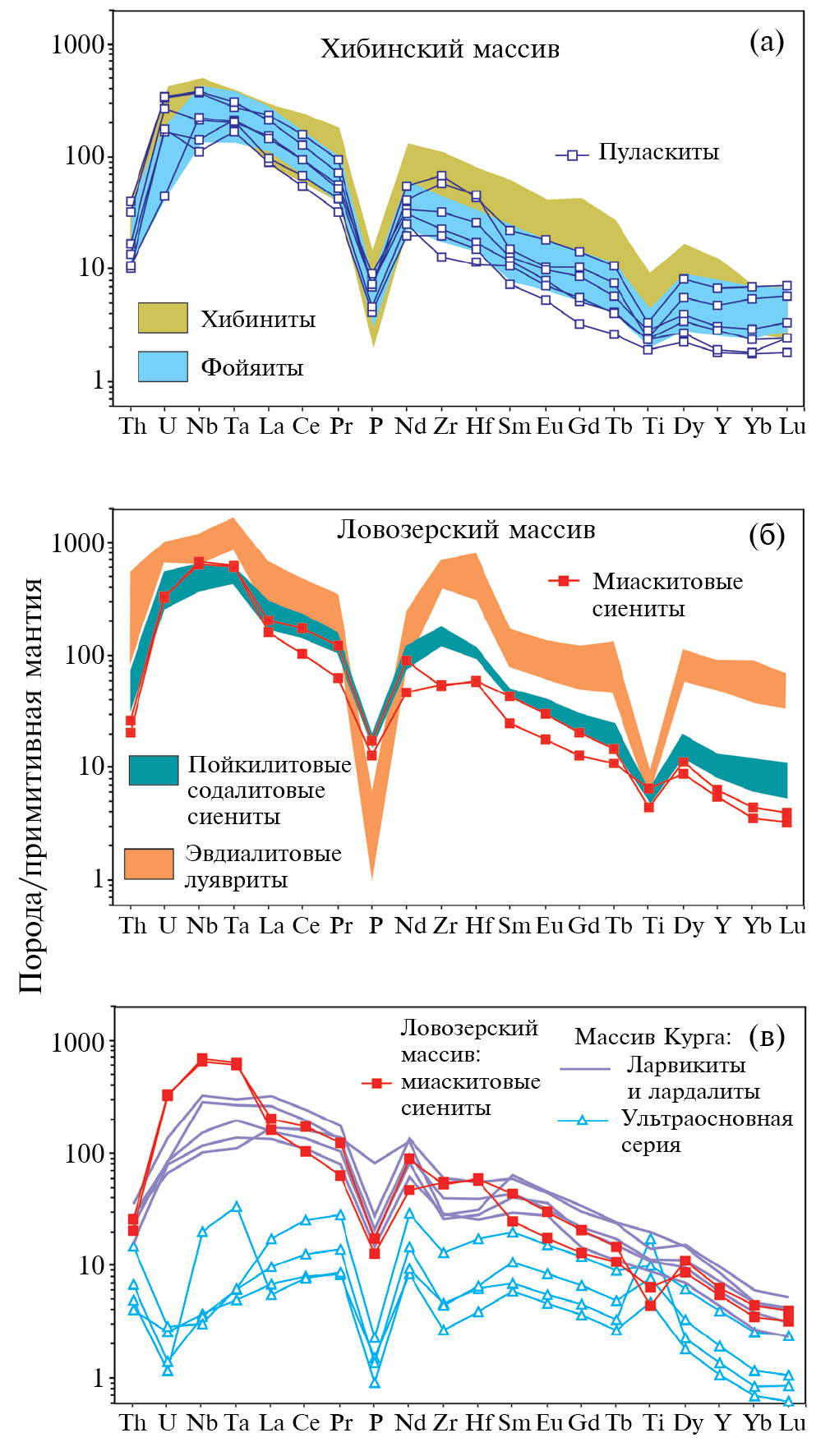 В образцах миаскитовых сиенитов из Ловозерского, Хибинского и Кургинского массивов были определены содержания главных и 40 микроэлементов, включая редкоземельные (REE).