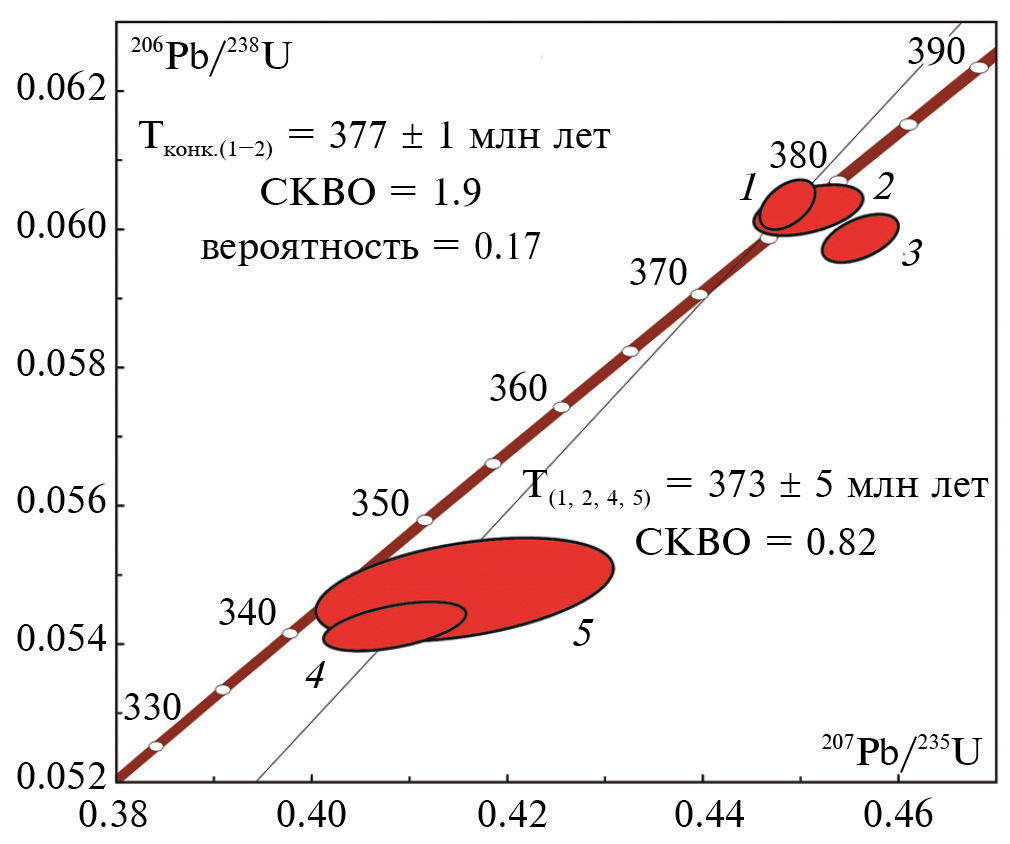 Отобранные для U-Pb геохронологических исследований микронавески наиболее прозрачных кристаллов циркона (1–50 зерен) подвергались высокотемпературному отжигу в муфельной печи “SNOL E5CC” в керамических или кварцевых тиглях при 850°C в течение 48 ч (Mattinson, 2005) с последующей кислотной обработкой смесью 35% HF + 15% HNO3 в пропорции 5:1 в течение 2–6 ч при 220°C. Последующее разложение циркона и выделение Pb и U выполнялось по стандартной методике (Krogh, 1973). Для изотопных исследований использован изотопный индикатор 202Pb-235U. Изотопные анализы выполнены на многоколлекторном масс-спектрометре TRITON TI в статическом и динамическом (при помощи счетчика ионов) режимах. Точность определения U/Pb отношений, а также содержаний U и Pb составила 0.5%. Холостое загрязнение не превышало 15 пг Pb и 1 пг U. Обработка экспериментальных данных проведена с использованием программ “PbDAT” и “ISOPLOT” (Ludwig, 1991, 2003). При расчете возрастов были использованы значения констант распада урана по (Steiger, Jager, 1976). Поправки на обычный свинец введены в соответствии с эволюционной моделью Стейси–Крамерса (Stacey, Kramers, 1975).