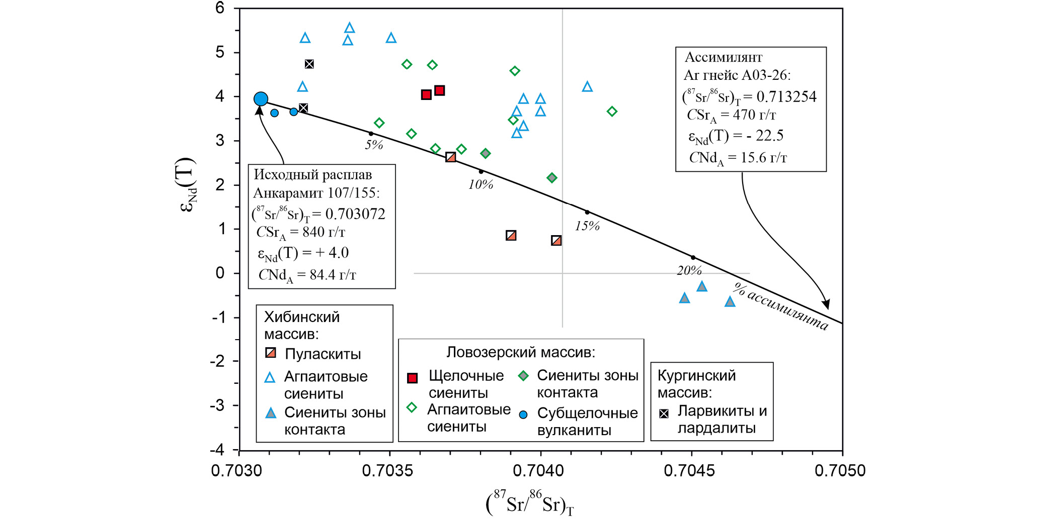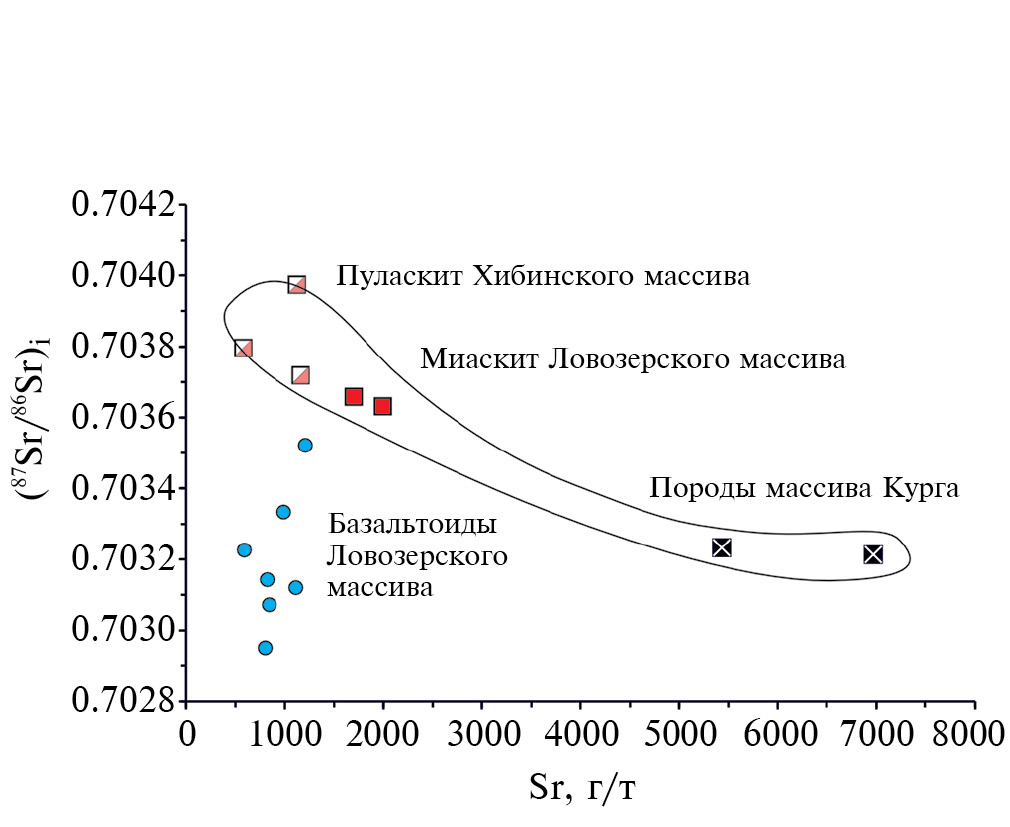 Анализ изотопно-геохимических характеристик пород субщелочной серии свидетельствует о мантийном происхождении миаскитов Ловозерского массива, отсутствии в них значимых признаков коровой контаминации и их образовании в ходе эволюции анкарамитового расплава, в ходе которой произошло формирование ультрабазитовых кумулатов Кургинской интрузии. Формирование пуласкитов Хибинского массива, происходившее по аналогичному сценарию, было осложнено ассимиляцией корового материала, доля которого, согласно модельным расчетам, могла составлять от 8 до 15%.