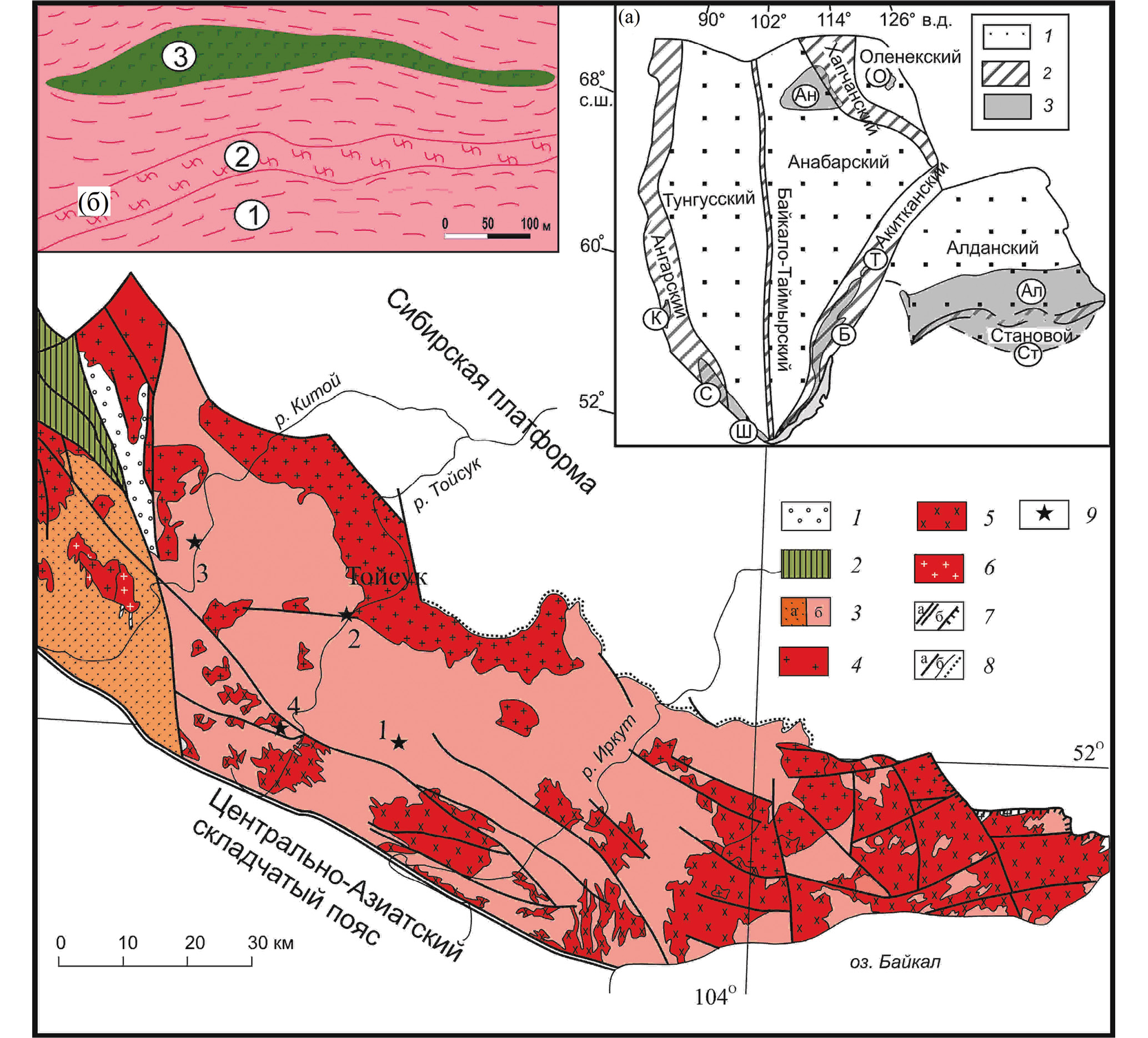 Рис. 1. Геологическая схема восточной части Шарыжалгайского выступа. 1 – палеопротерозойские отложения; 2 – мезоархейские метаосадочно-вулканогенные отложения Онотского ЗКП; 3 – архейские гранулитогнейсовые комплексы Китойского (а) и Иркутного (б) блоков; 4 – палеопротерозойские гранитоиды; 5 – архей-палеопротерозойские гранитоиды нерасчлененные; 6 – архейские гранитоиды; 7 – тектонические границы: (а) – разломы, (б) – надвиги; 8 – геологические границы (а), границы несогласного залегания (б), 9 – проявления палеопротерозойского мафического магматизма: 1 – Полуденный массив, 2 – мафические включения и дайка в приконтактовой зоне Тойсукского массива, 3 – Китойский дайковый рой, 4 – Малозадойский массив. На врезке (а). Главные тектонические элементы Сибирского кратона. 1 – супертерейны, 2 – палеопротерозойские орогенные пояса, 3 – выступы фундамента: Ал – Алданский, Ст – Становой, О – Оленекский, Ан – Анабарский, К – Канский, С – Cаянский, Ш – Шарыжалгайский, Б – Байкальский, Т – Тонодский, по (Donskaya, 2020) с изменениями. На врезке (б). Геологическая схема Малозадойского массива. 1 – двупироксеновые сланцы, 2 – гнейсы, 3 – плагиоперидотиты и габброиды Малозадойского массива.