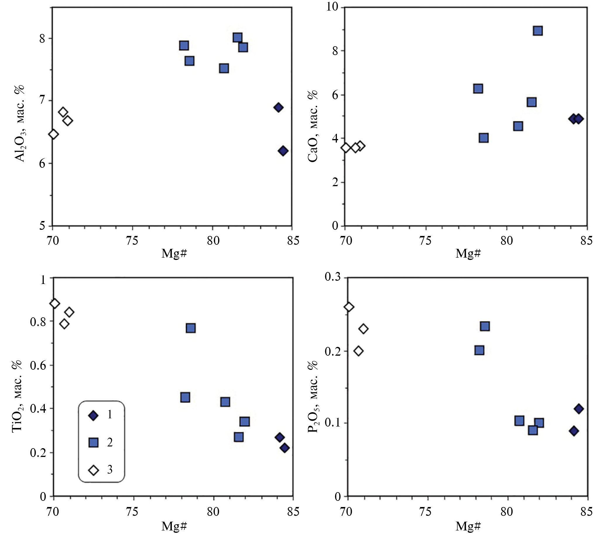 Плагиоперидотиты (SiO2 = 45.7–46.5 мас. %) имеют максимальную магнезиальность (MgO = 27.9–30.0 мас. %, Mg# = 82–78) и относительно обеднены TiO2 (0.22–0.27 мас. %) и P2O5 (0.09–0.12 мас. %) при повышенном содержании K2O (0.48–0.53 мас. %). Габбронориты характеризуются содержанием SiO2 от 46 до 52 мас. % и высокой магнезиальностью (MgO = 18.5–24.0 мас. %, Mg# = 84–70), пониженными концентрациями TiO2 (0.34–0.88 мас. %), P2O5 (0.10–0.26 мас. %) и повышенной K2O (0.35–0.90 мас. %) (табл. 1, рис. 2). В ряду плагиоперидотиты–габбронориты при снижении магнезиальности происходит рост концентраций TiO2 и P2O5 при практически постоянном содержании щелочей (рис. 2), максимальные концентрации Al2O3 и CaO наблюдаются в оливиновых габброноритах. Увеличение содержания TiO2 сопровождается ростом концентраций некогерентных, прежде всего высокозарядных элементов: Nb и Zr (рис. 3).