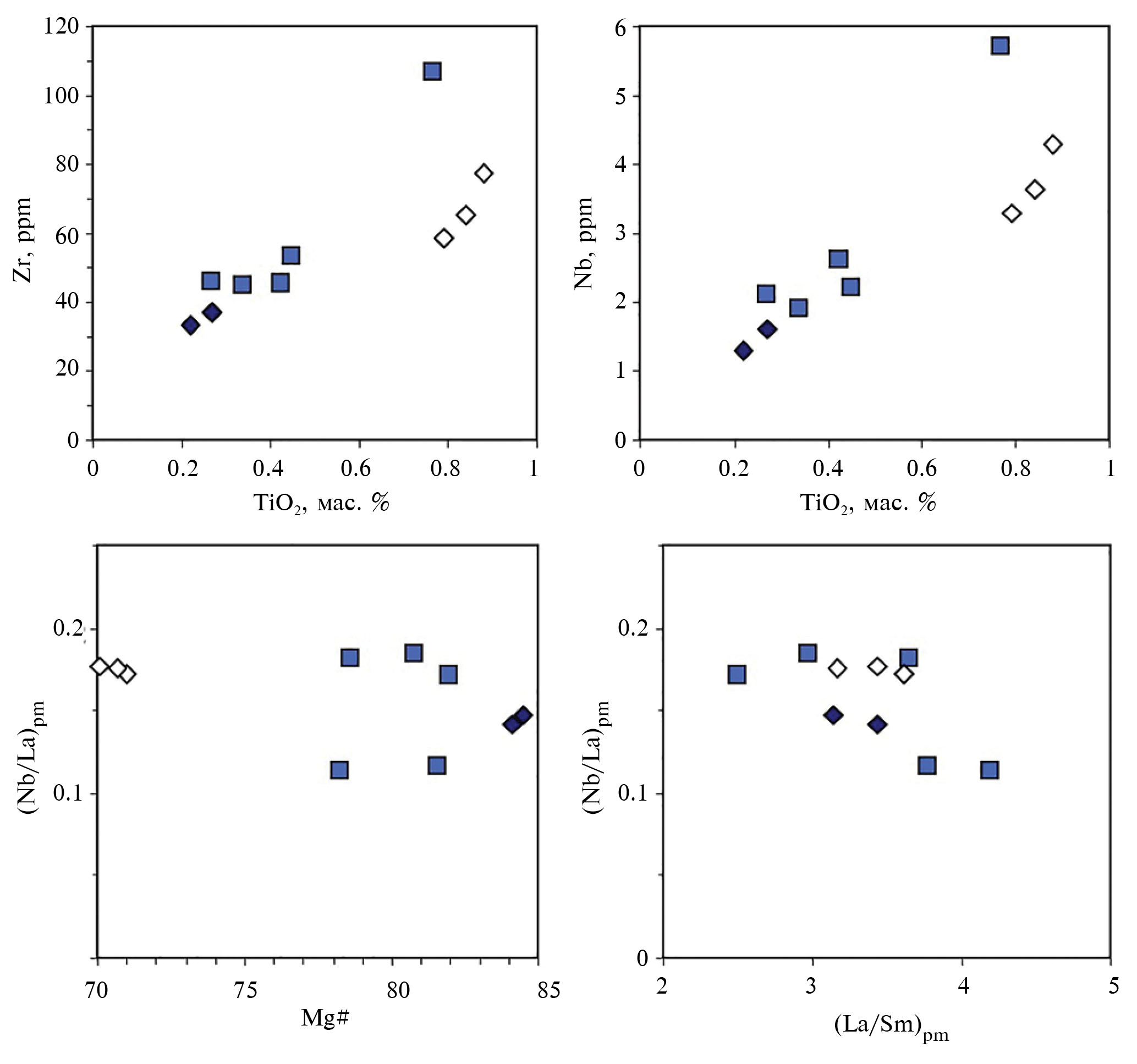 Все породы имеют фракционированные спектры РЗЭ с повышенными значениями (La/Sm)n = = 2.5–4.2 и (La/Yb)n = 6.6–13.9 (рис. 3, 4а). Характерная черта всех пород – повышенное значение (Gd/Yb)n = 1.5–2.2. Спектры габброноритов имеют слабый Eu-минимум (Eu/Eu* = 0.73–0.98). Мультиэлементные спектры демонстрируют резкие минимумы по Nb и Ti и максимум по Sr (рис. 4б). Обеднение Nb относительно легких РЗЭ не обнаруживает зависимости от степени их фракционирования, выраженной через Mg#, а величины (Nb/La)pm и (La/Sm)n имеют узкий диапазон вариаций, что характерно для процесса фракционной кристаллизации (рис. 3).