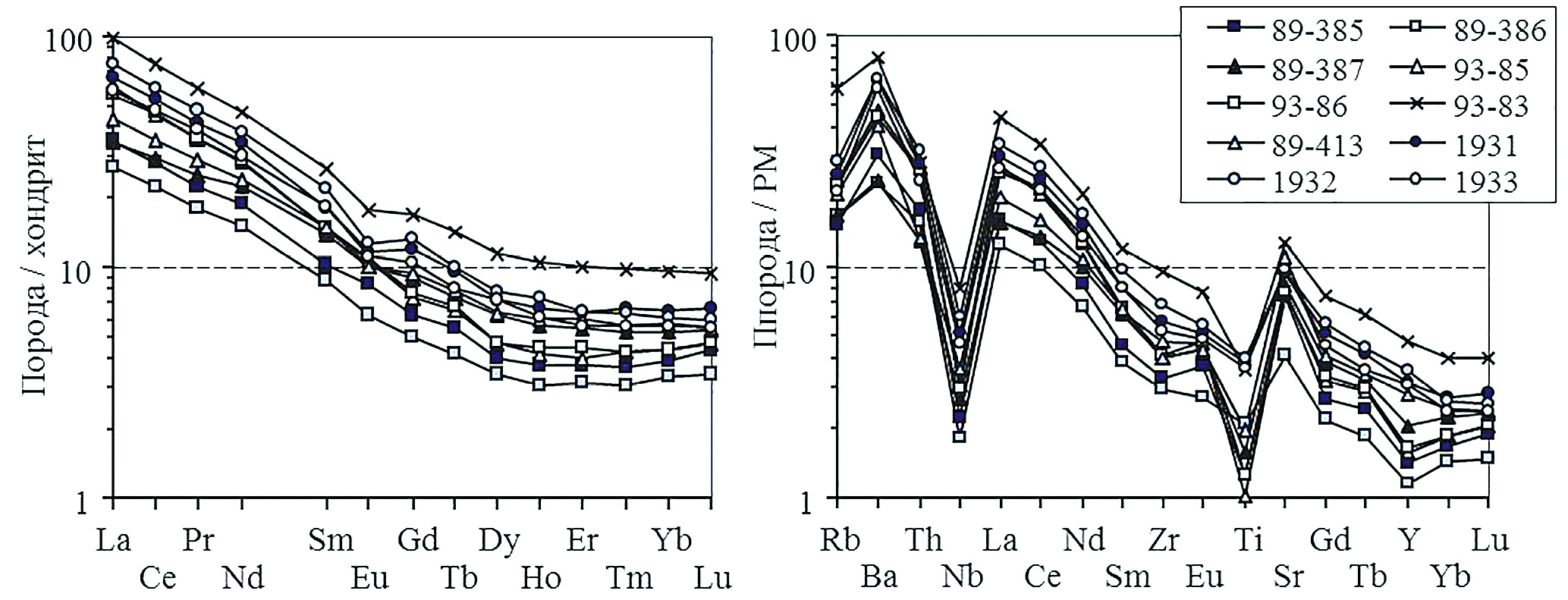 Рис. 4. Редкоземельные (нормировано по (Boynton, 1984)) и мультиэлементные (нормировано по (Sun, McDonough, 1989)) спектры пород Малозадойского массива.