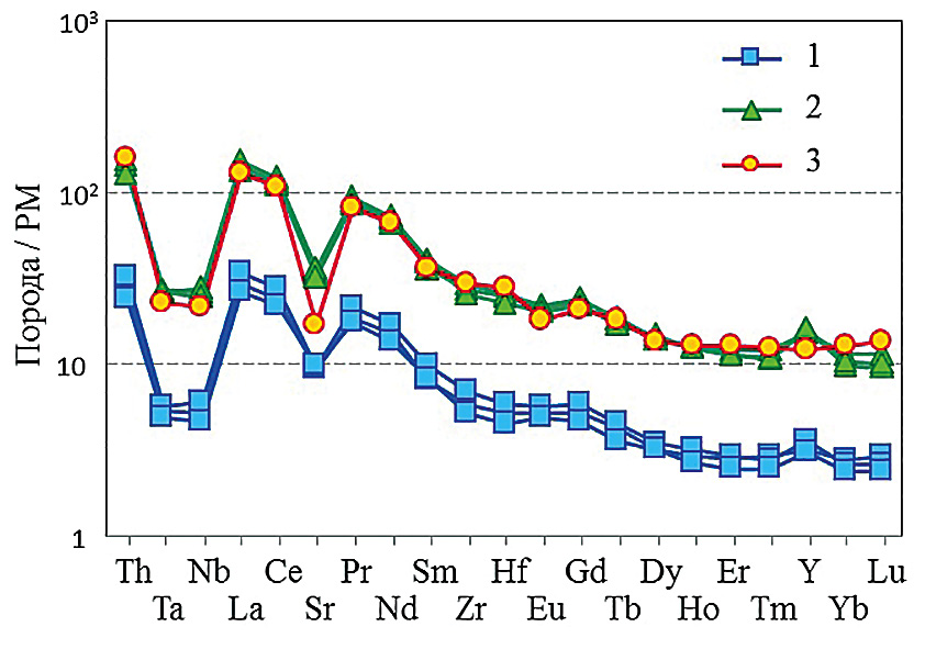 Содержание главных и редких элементов в породах определены в ЦКП многоэлементных и изотопных исследований ИГМ СО РАН (г. Новосибирск) рентгенофлюоресцентным методом на спектрометре ARL-9900 XL и методом ICP-MS на масс-спектрометре высокого разрешения ELEMENT (Finigan Mat) с ультразвуковым распылителем U-5000AT+ по методике (Николаева и др., 2008). На стадии химической подготовки образцов использовали сплавление с особо чистым метаборатом лития при 1050°C в платиновых тиглях с последующим растворением полученного сплава в разбавленной азотной кислоте. Для обеспечения стабильности полученного раствора поддерживали общую кислотность на уровне 5% HNO3 и добавляли следовые количества HF, что необходимо для корректного определения высокозарядных элементов. Сплавление при высокой температуре обеспечивает разложение практически всех наиболее трудновскрываемых минералов, которые могут быть концентраторами редкоземельных и высокозарядных элементов, а повышение кислотности и добавки HF в качестве комплексообразователя стабилизируют эти растворы и минимизируют потери высокозарядных элементов, которые могут происходить в результате гидролиза при низкой кислотности. Пределы обнаружения редкоземельных и высокозарядных элементов составляли от 0.005 до 0.1 мкг/г. Точность анализа составляла в среднем 2–5 отн. %.