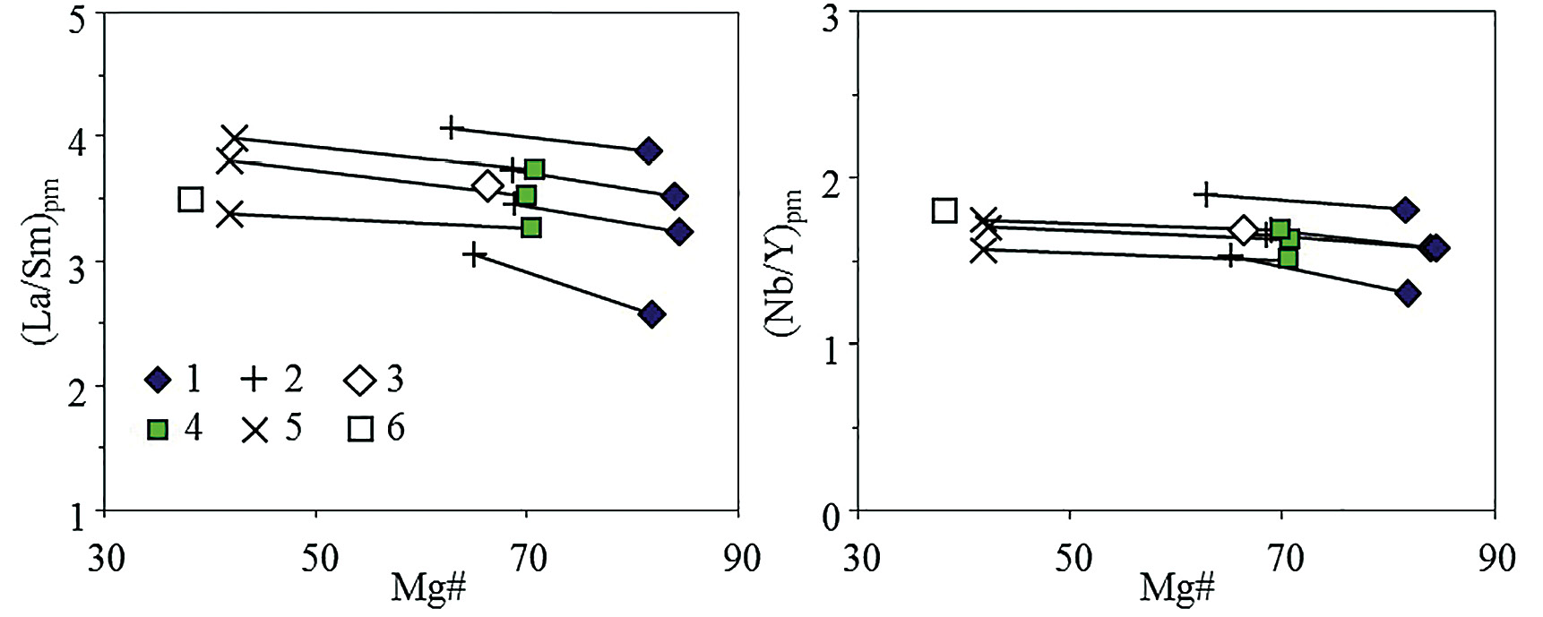 Ассоциации магматических пород основного состава, наряду с перидотитовыми ксенолитами, служат главным источником информации о составе мантии. В случае базальтов для оценки геохимических параметров их мантийных источников используются отношения несовместимых редких элементов с близкими и низкими коэффициентами распределения, относительно слабо фракционирующих между собой при плавлении (Hofmann, 1997). Ключевой для суждения о характере мантийного источника является информация о геохимических параметрах исходного расплава. При этом для базальтов и их субвулканических аналогов, чтобы минимизировать влияние фракционной кристаллизации для геохимического анализа, выбираются наиболее магнезиальные разности, потенциально близкие к исходному расплаву, или предварительно производится оценка состава последнего в предположении о фракционировании одной кристаллизующейся фазы – оливина (например, Ciborowski et al., 2014, 2017). Для этого используется программа Petrolog3 (Danyushevsky, Plechov, 2011) или алгоритм PRIMELT3 (Herzberg, Asimov, 2015), моделирующие добавку оливина с последовательным приближением к составу расплава, который может быть равновесен с мантийными перидотитами.