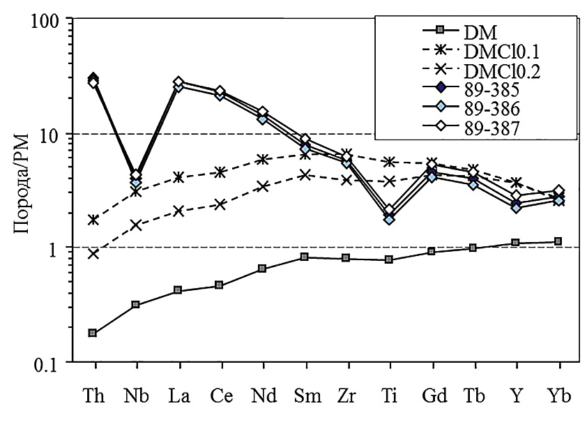 Кроме того, в меньшей степени имеет место расхождение по содержанию Zr, более высокому для модельных расплавов. Поскольку фракционирование Zr между перидотитовым реститом и мафическим расплавом определяется в основном гранатом, можно предположить, что это расхождение обусловлено корректностью имеющихся данных по коэффициенту распределения этого минерала.