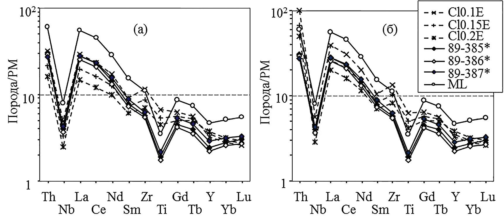 Рис. 9. Мультиэлементные спектры модельных расплавов из обогащенных мантийных перидотитов, образованных при взаимодействии с кислым расплавом из базальтов (а) и терригенных осадков (б) в сравнении с предполагаемыми исходными расплавами для оливиновых габброноритов (образцы 89-385*, 89-386*, 89-387*) и модельным расплавом, равновесным с перидотитами/оливиновыми габброноритами (ML).