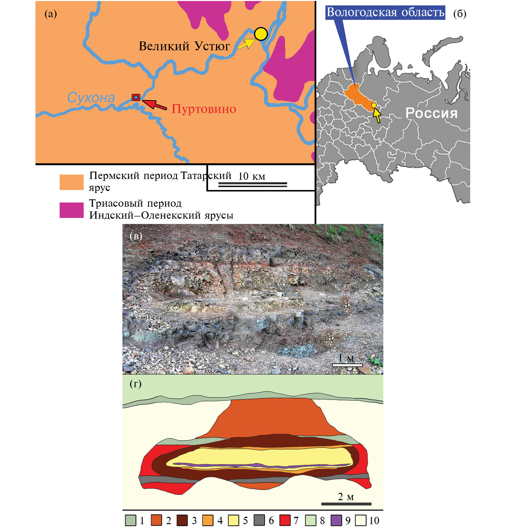 Рис. 1. Местоположение и схема геологического строения р-на Пуртовино (а, б), составленная на основе карт дочетвертичной геологии Вологодской области (Буслович, 2000, и др.). (в) Фотоизображение расчистки исследованного тела. (г) Схема геологического строения тела (составлена с использованием материалов А.И. Труфанова): 1 – мергель зеленовато-серый, трещиноватый; 2 – аргиллит кирпично-красный, с отложением карбонатов кальция по плоскостям трещиноватости; 3 – алевролит бурый до кирпично-красного, трещиноватый, термально измененный, с пленками карбонатов по плоскостям трещиноватости; 4 – мергель кирпично-красный, термально измененный, с белесым налетом карбонатов; 5 – алевролит от светло-желтого до зеленовато-серого цветов, термально измененный, трещиноватый (по трещинам бурые карбонатно-железистые образования); 6 – мергель красно-бурого цвета с пятнистостью в светлых серо-зеленых тонах. По трещинам отмечается карбонатизация и развитие аргиллита от коричневого до серого цветов с зеленоватым оттенком и раковистым изломом; 7 – алевролит бурого цвета с тонкими прослойками аргиллита и мергеля, развитые за пределами ореола термально измененных пород; 8 – задернованная осыпь; 9 – тело щелочного микроклинопироксента. В верхнем контакте мучнистый белый налет карбонатно-кремнистого материала местами до 0.5 см толщиной; 10 – материал осыпи на склоне (местами задернован) и фрагменты пород расчистки обнажения.