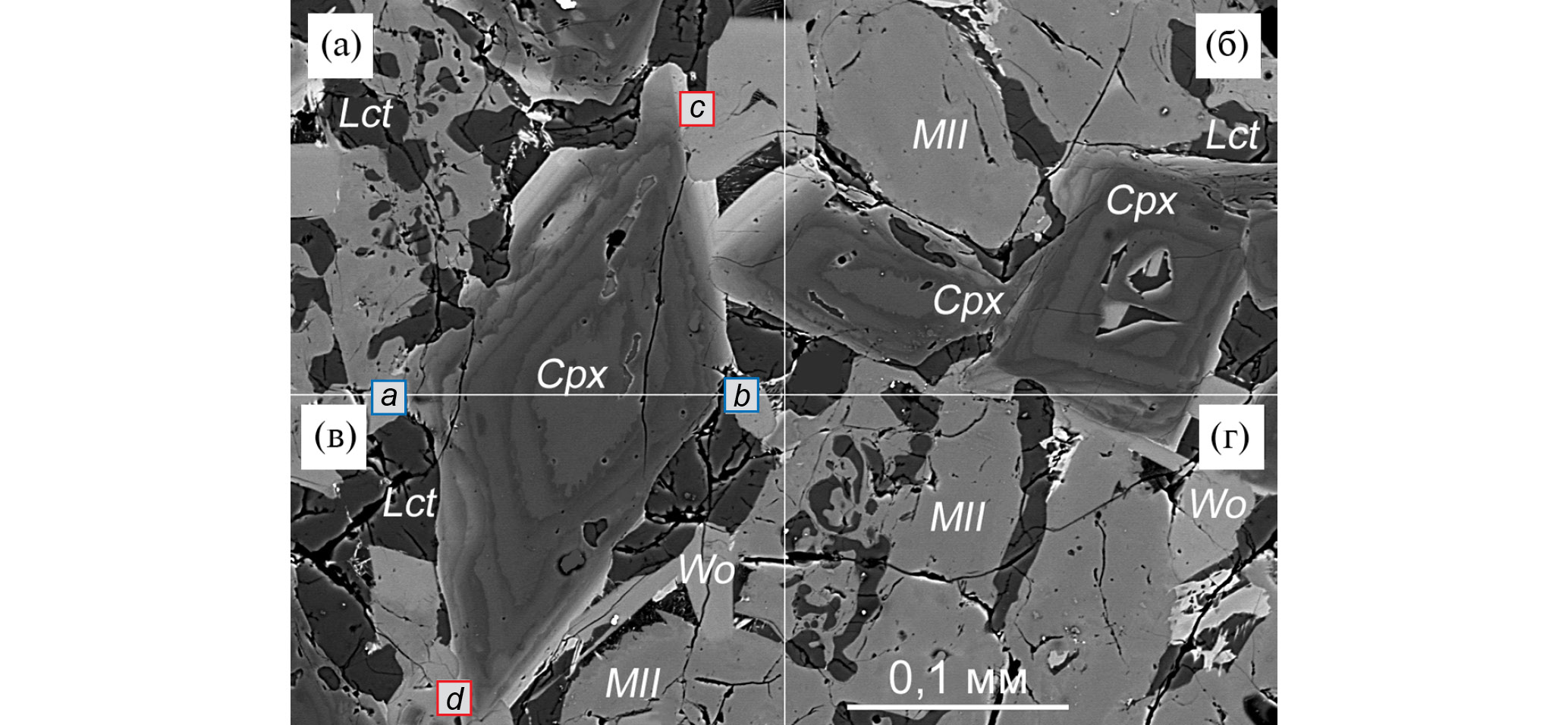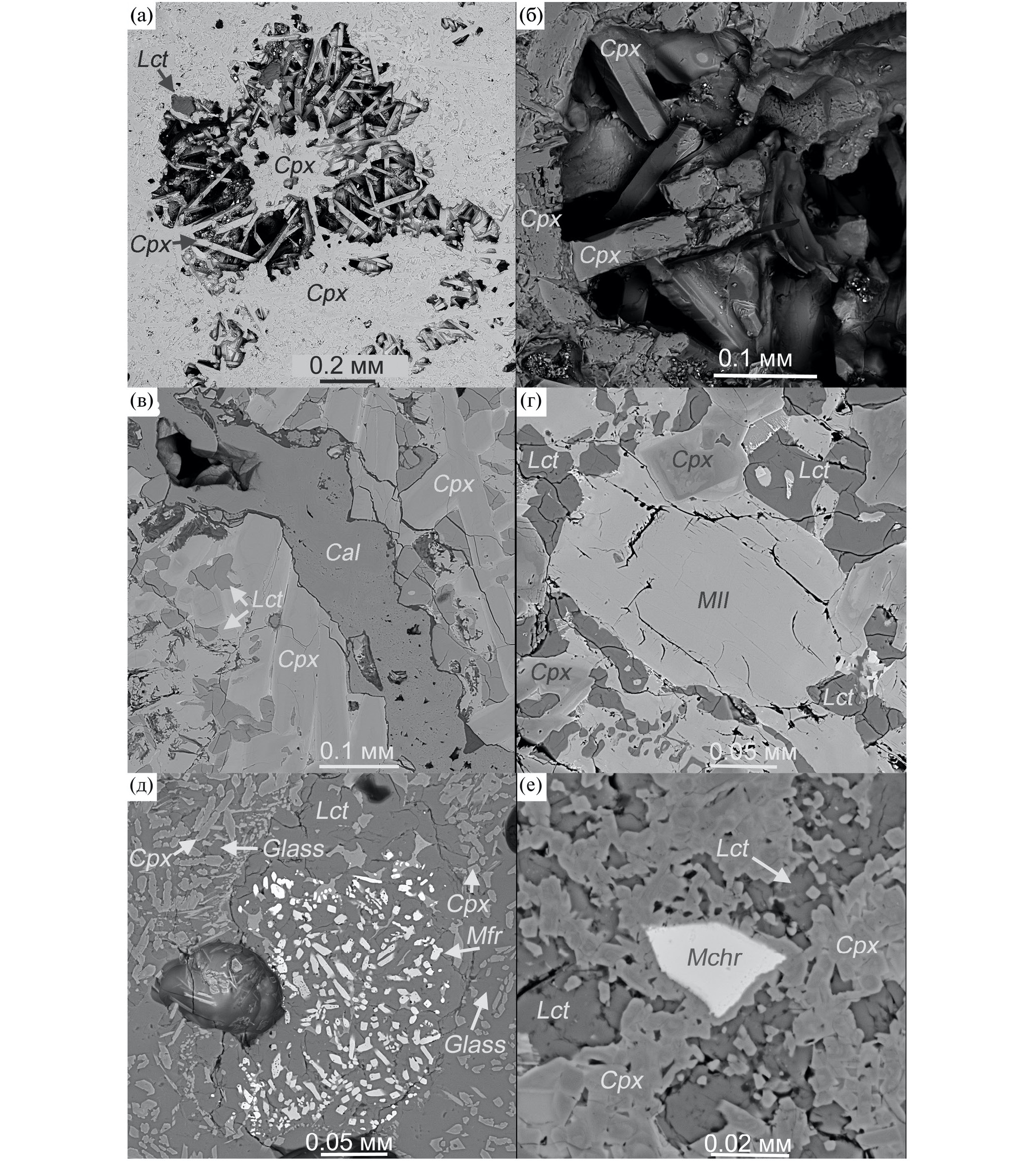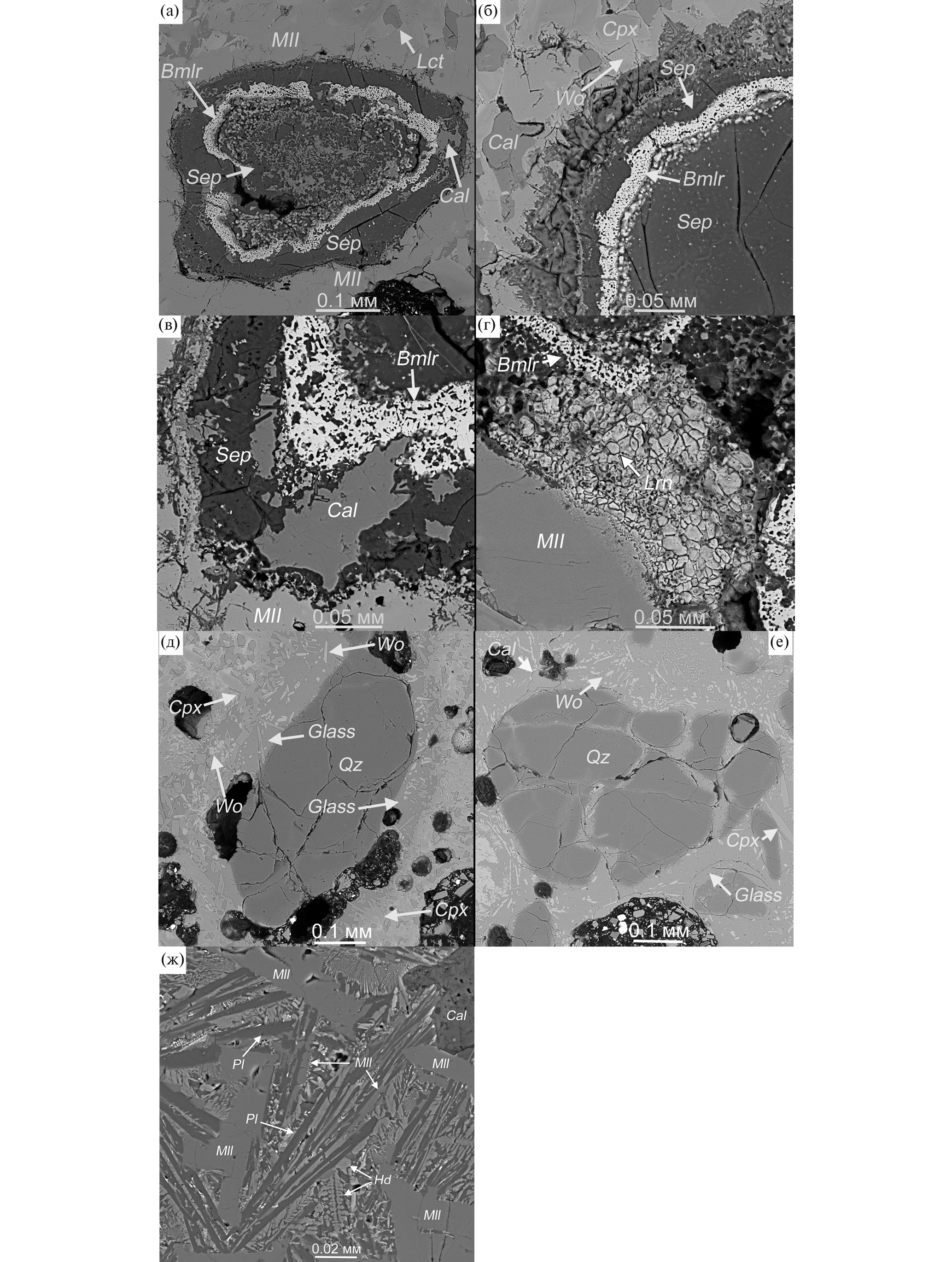 Волластонит образует небольшие зерна (до 0.1 мм), ассоциирующие с клинопироксеном и мелилитом (рис. 5а–5г) или включения в стекле (рис. 4д, 4е). Он обычно содержит до 2 и 1 мас. % MgO и FeO соответственно (Supplementary 1, ESM_4). Включения и прожилки кальцита достигают 0.3–0.4 мм в длину (рис. 3в, 4б, 4в). Составы зерен могут быть существенно обогащены Mg (6 мас. % MgO; Supplementary 1, ESM_5). Кальцит, относимый к более поздней генерации, развит в ассоциации с сепиолитом (рис. 4a, 4в). Микрозернистые кластеры ларнита ассоциируют с зернами мелилита (рис. 4г). Состав ларнита (Supplementary 1, ESM_6) весьма близко соответствует Ca2SiO4.