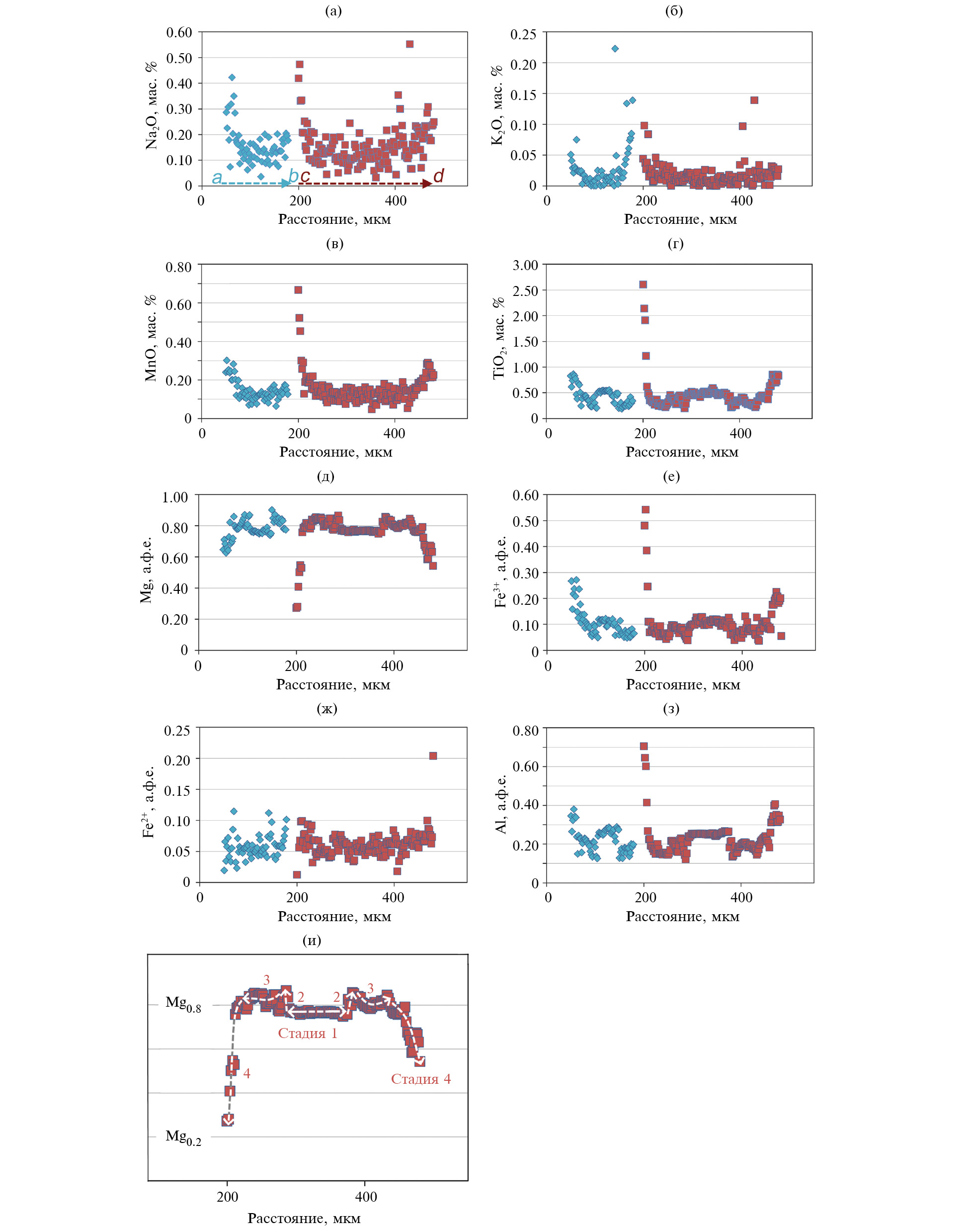 На диаграмме Mg–Fe (рис. 6a) выявленный ряд составов клинопироксена является примечательно протяженным, несмотря на сравнительно небольшой размер щелочно-ультрабазитового тела. Эта особенность может увязываться с высоким содержанием летучих компонентов, чем были существенно пролонгированы интервалы кристаллизации, обусловившие широкие эволюционные тренды Cpx (рис. 6a–6е). Наиболее крупные зерна Cpx (~2 мм длинной) кристаллизовались в участках с повышенным содержанием летучих компонентов. Нами отмечаются четыре стадии кристаллизации зональных зерен Cpx (рис. 5a–5г, 7a–7з). Стадия 1 на рис. 7и знаменует самый ранний период нормальной кристаллизации, проходящей в объеме относительно окисленного расплава, что привело к формированию Fe3+-содержащего ядра. Ко времени завершения этой стадии физико-химические условия в среде минералообразования кардинально изменились в вероятностной связи со стремительным охлаждением тела. Ядерная часть кристалла несколько резорбируется (рис. 5a, 5в) перед началом следующей стадии. В ходе стадии 2 на рис. 7и происходит аномальная или метастабильная кристаллизация, регистрируемая по неожиданному увеличению содержания Mg, что увязывается с ростом fO2, обеспечившим конверсию Fe2+ → Fe3+ и тем самым возрастание значения Mg# в дифференцированном расплаве. Стадия 3, или стадия “адаптации”, выражает стремление зонального кристалла продолжить кристаллизацию в изменившихся условиях системы. Стадия 4, или заключительная стадия, отражает основной этап падения температуры в комбинации с продолжившимся ростом fO2, чем обусловлено развитие в кайме эссенеита, обогащенного Al, Ti, Mn и щелочными металлами (рис. 7a–7з). Две схемы изоморфных замещений прослеживаются в составах клинопироксена в его разных текстурно-структурных разновидностях (рис. 6a–6е): Mg2+ + Si4+ → (Fe3+ + Al3+); (Ti4+ + Al3+) + (Na + K)+ → 2Mg2+ + Si4+.