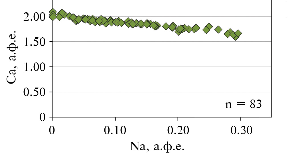 Рис. 9. Вариации составов минералов серии акерманит–геленит на диаграмме Ca–Na, выраженные в значениях атомов на форм. ед. (а. ф. е.) (n = 83).