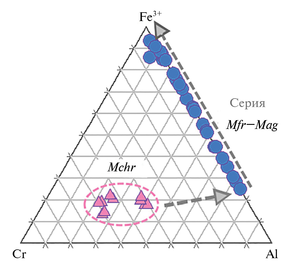 Рис. 10. Вариации составов магнезиохромита (Mchr; n = 10) и членов серии магнезиоферрит–магнетит (Mfr–Mag; n = 30) на треугольной диаграмме Cr–Fe3+–Al. Несколько составов шпинели, обогащенной Fe3+ (компонентом Mfr), условно включены в наблюдаемую серию Mfr–Mag.