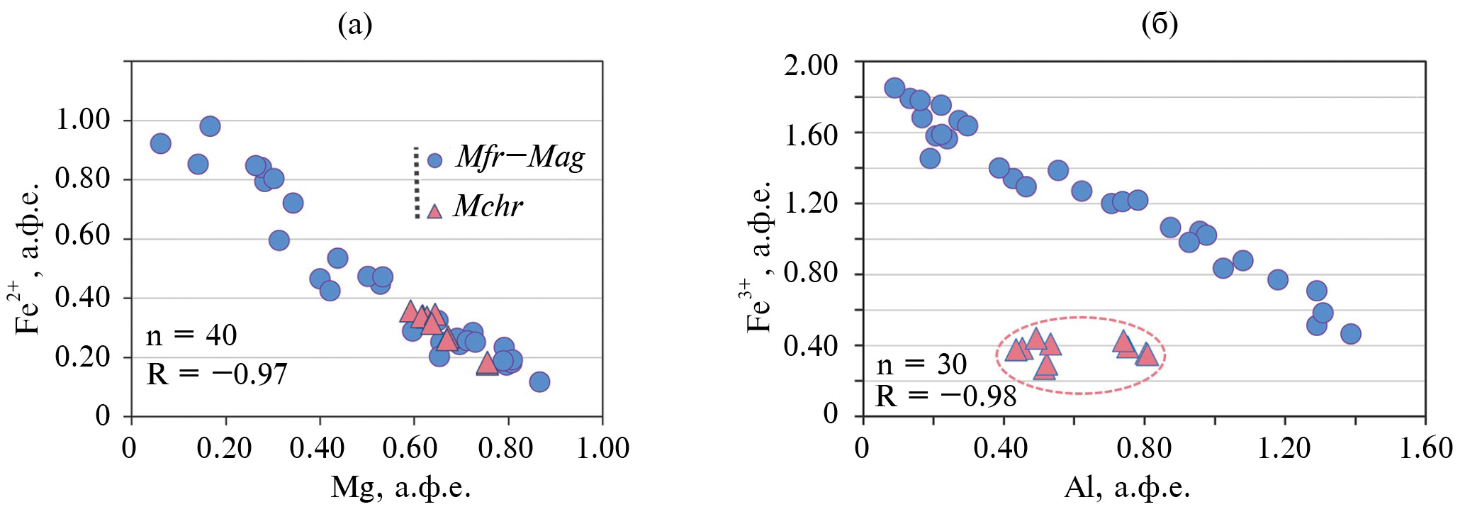 Рис. 11. Вариации составов магнезиохромита (Mchr) и членов серии магнезиоферрит–магнетит (Mfr–Mag) на диаграммах Fe2+–Mg (a) и Fe3+–Al (б), выраженные в значениях атомов на форм. ед. (а. ф. е.). Значение коэффициента корреляции (R), указанное на рис. 11б, рассчитано на основе составов членов серии Mfr–Mag (n = 30).
