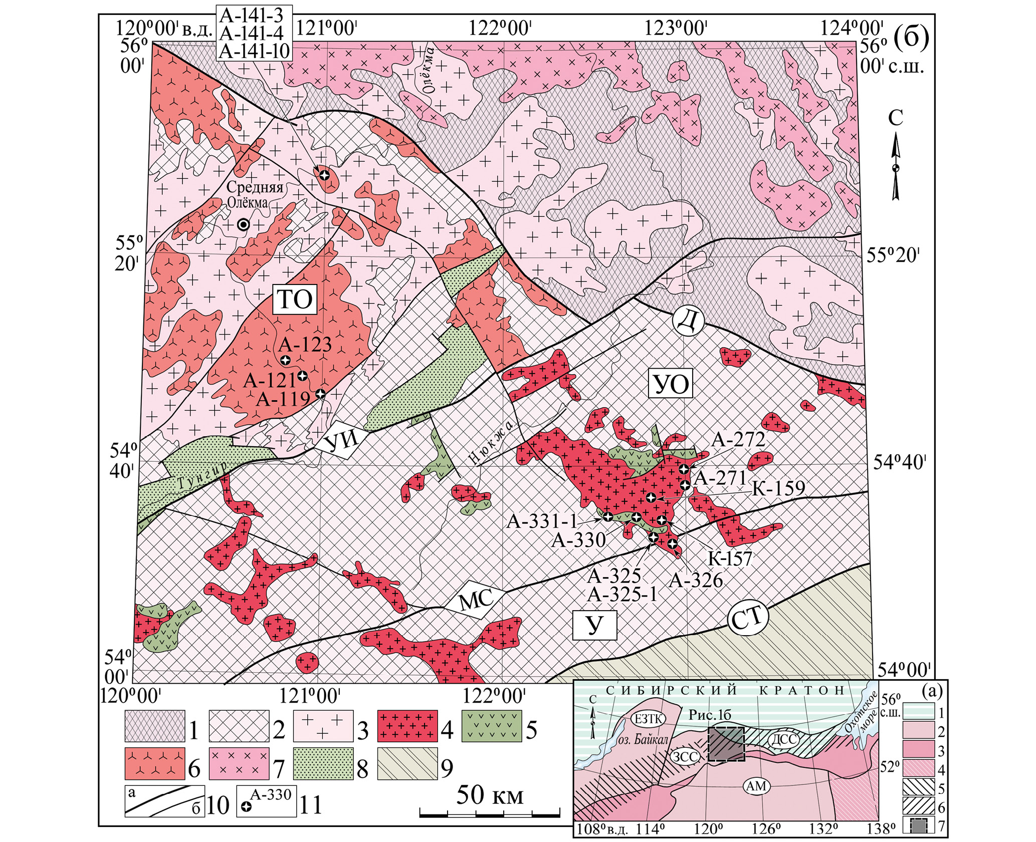 Рис. 1. (а) Геологическое положение позднемезозойского Станового вулкано-плутонического постколлизионного пояса в складчатом обрамлении Сибирской платформы. 1 – Сибирский кратон; ДСС – Джугджуро-Становой раннедокембрийский супертеррейн, претерпевший в мезозое интенсивную структурно-метаморфическую и тектоно-магматическую переработку; 2–4 – складчатые пояса: 2 – Центрально-Азиатский (ЕЗТК – Енисей-Забайкальский тектонический коллаж, ЗСС – Западно-Становой супертеррейн, АМ – Амурский микроконтинент), 3 – Монголо-Охотский, 4 – Сихотэ-Алинский; 5, 6 – позднемезозойские рифтовые системы: 5 – Западно-Забайкальская, 6 – Становой вулкано-плутонический пояс; 7 – рис. 1б. (б) Схема размещения амананского, амуджиканского и укурейчского магматических комплексов Станового вулкано-плутонического пояса в зоне сочленения Джугджуро-Станового и Западно-Станового супертеррейнов, по (Государственная …, 2009) с изменениями. 1, 2 – дораннемеловые метаморфические и магматические породы: 1 – Джугджуро-Станового супертеррейна (гнейсы, гнейсограниты и мигматиты станового комплекса, кристаллосланцы ларбинской и дамбукинской серий и магматические породы раннего докембрия и раннего мезозоя), 2 – Западно-Станового супертеррейна (гнейсы, сланцы и мигматиты тунгирской, ирмакитской и верхнеолекминской серий, кристаллические сланцы могочинского комплекса, магматические породы ранедокембрийского, палеозойского и раннемезозойского возраста; 3 – раннемеловые коллизионные гранитоиды древнестанового и позднестанового комплексов; 4–8 – геологические образования раннемелового Станового вулкано-плутонического пояса: 4 – гранитоиды амуджиканского комплекса, 5 – укурейский трахиандезит-риолитовый вулканический комплекс (свита) и нерчинская серия, 6 – гранитоиды амананского комплекса, 7 – гранитоиды тындинско-бакаранского комплекса, 8 – терригенные породы инегирской серии и тигнинской свиты; 9 – Монголо-Охотский складчатый пояс; 10 – дизъюнктивные нарушения (а – главные, б – второстепенные); 11 – места отбора геохронологических и изотопно-геохимических проб. Буквами в кружках обозначены структурные швы (Д – Джелтулакский, СТ – Северо-Тукурингрский); буквами в ромбах – межблоковые разломы (УИ – Урюмо-Инарогдинский, МС–Могоча-Сергачинский), буквами в квадратах – тектонические блоки Западно-Станового супертеррейна (У – Урканский, УО – Уруша-Ольдойский, ТО – Тунгиро-Олекминский).