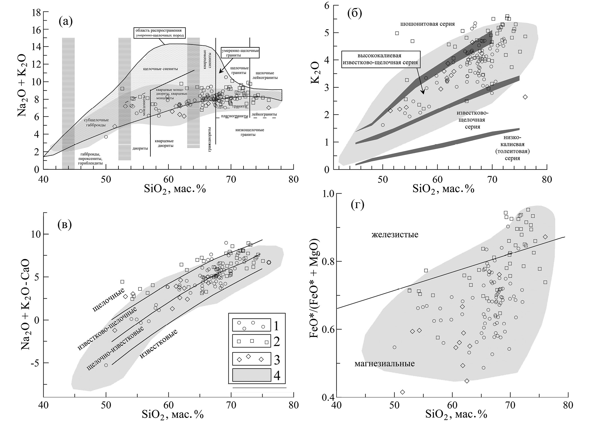 Породы амуджиканского комплекса характеризуются вариациями SiO2 от 50 и до 72.1 мас. % при явном преобладании пород кислого состава (табл. 1). Они отличаются умеренными или повышенными содержаниями щелочей (рис. 2а) и существенными вариациями их отношений ((K2O + Na2O) = 7.12–10.50 мас. % и K2O/Na2O = = 0.67–1.50), а также повышенной известковистостью (CaO = 1.07–4.48 мас. %). В координатах K2O–SiO2 составы этих гранитоидов находятся, главным образом, в поле пород высококалиевой известково-щелочной серии и лишь частично – в поле пород шошонитовой серии (рис. 2б), при этом индекс агпаитности (A/NK) сравнительно невелик (0.65–0.87). На диаграмме (Na2O + K2O – – CaO)–SiO2 большая часть точек их состава располагается в полях пород известково-щелочной и щелочно-известковой серий (рис. 2в). Индекс плюмазитности (A/CNK = 0.80–1.04) указывает на вариации составов пород от умеренно-глиноземистых до низкоглиноземистых (рис. 3). Железистость гранитоидов сильно варьирует (0.53–0.90), однако на диаграмме FeO*/(FeO* + MgO)–SiO2 (рис. 2г) практически все точки лежат в поле магнезиальных пород.