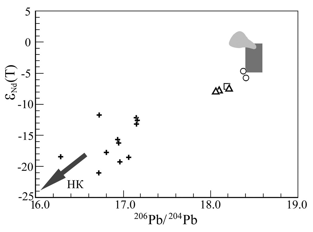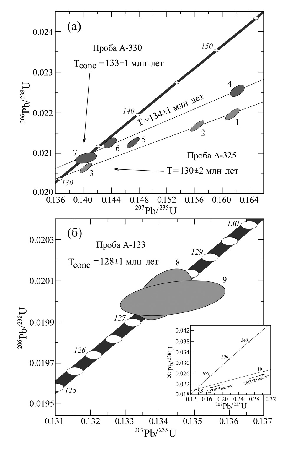 Для измерения изотопного состава обыкновенного Pb пород использовались полевые шпаты, как минералы с наиболее низкими значениями µ (238U/204Pb). Образцы полевых шпатов выделялись по стандартным методикам. После чего фракции отмывались от поверхностных загрязнений 10% раствором двунатриевой соли этилендиаминтетрауксусной кислоты, затем растирались в пудру. После этого фракции полевых шпатов выщелачивались 0.5 N плавиковой кислотой при 20°С 10 мин, 11 N HCl 4 ч при 80°С, затем 12 ч при 20°С, далее по такой же схеме они выщелачивались 16 N HNO3. Выщелачивание производилось для того, чтобы удалить возможно присутствующий радиогенный Pb. Остаток после выщелачивания разлагался при 110°C смесью концентрированных HF и HNO3. Химическое выделение Pb и U из пород проводилось на анионообменной смоле Bio-RadAG1-X8 в растворах кислот HBr-HCl, согласно методике (Manhes et al., 1984). Изотопный анализ Pb и U выполнялся в остатках от выщелачивания и выщелоках на многоколлекторном масс-спектрометре Finnigan MAT-261 в режиме одновременной регистрации ионных токов исследуемых элементов с погрешностью внутри опыта 0.01% (2σ). Изотопный состав Pb и U измерялся в одноленточном режиме на рениевых испарителях. Для измерений использовался силикатный эмиттер в смеси с H3PO4. Общий уровень лабораторного загрязнения Pb и U не превышал 0.1 и 0.01 нг соответственно. Поправка изотопных отношений Pb на фракционирование проводилась по методике двойного изотопного разбавления с использованием изотопного индикатора 235U-204Pb-207Pb (Мельников, 2005). Ошибки измерения изотопных отношений 206Pb/204Pb, 207Pb/204Pb и 208Pb/204Pb, определенные по серии параллельных анализов стандарта BCR-1, не превышают 0.03, 0.03 и 0.05% соответственно. Расчеты изотопных отношений и содержаний Pb и U проводили с использованием программы PBDAT (Ludwig, 1991). Расчеты модельных параметров проведены с помощью программы “ISOPLOT” (Ludwig, 1988).