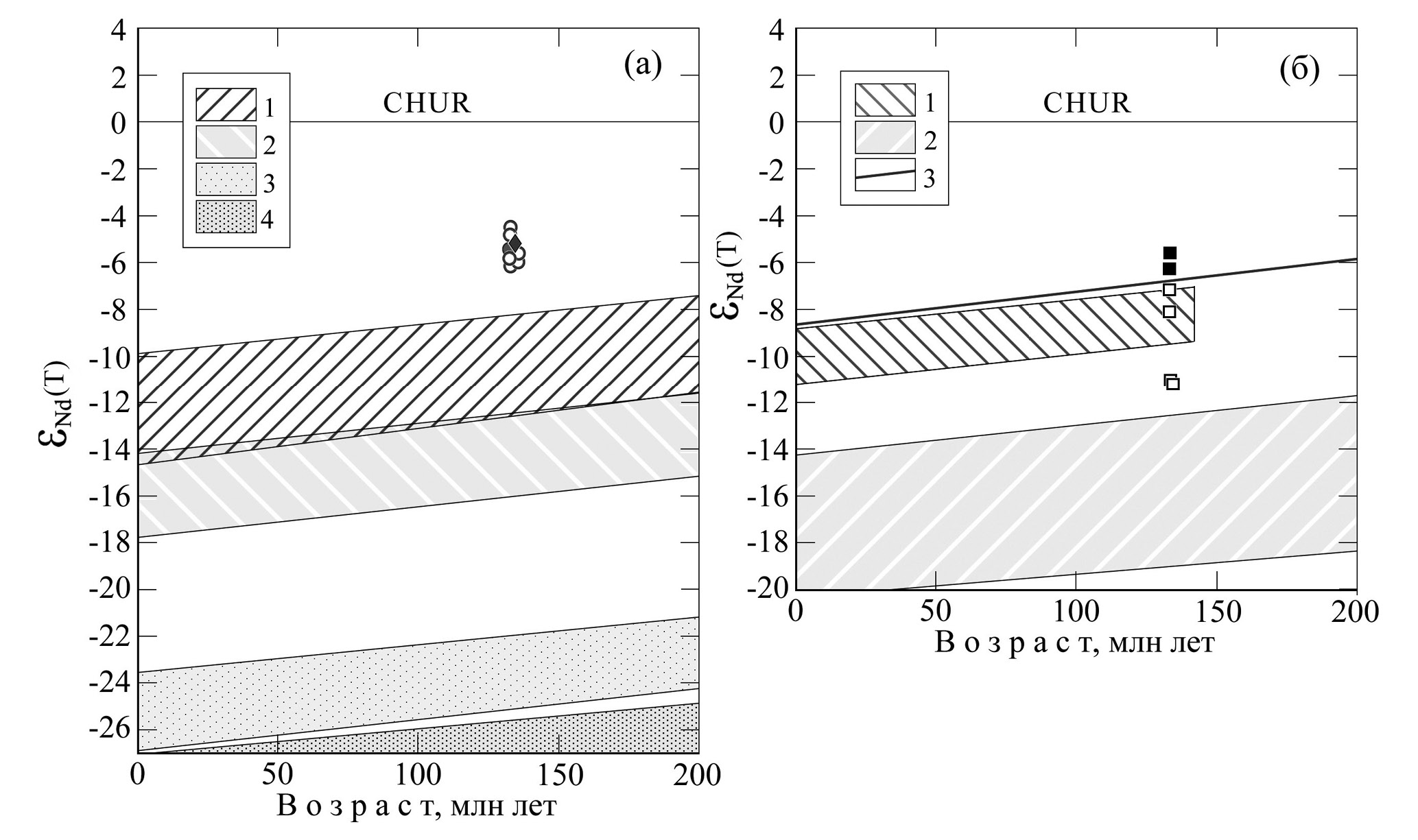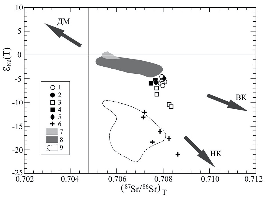 При расчете величин eNd(Т) и модельных возрастов ТNd(DM) использованы современные значения однородного хондритового резервуара (CHUR) по (Jacobsen, Wasserburg, 1984) (143Nd/144Nd = 0.512638, 147Sm/144Nd = 0.1967) и деплетированной мантии (DM) по (Goldstein, Jacobsen, 1988) (143Nd/144Nd = = 0.513151, 147Sm/144Nd = 0.21365). Для учета возможного фракционирования Sm и Nd во внутрикоровых процессах для коровых (S-тип) гранитоидов и осадочных пород рассчитаны двустадийные (“коровые”) Nd модельные возрасты ТNd(C) (Keto, Jacobsen, 1987), используя среднекоровое значение 147Sm/144Nd = 0.12 (Taylor, McLennan, 1985).