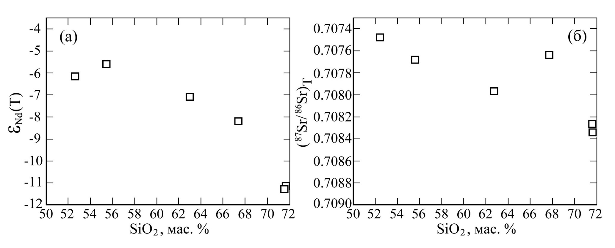 Для Sm-Nd и Rb-Sr изотопных исследований навески около 100 мг, растертых в пудру образцов горных пород, к которым были добавлены смешанные изотопные индикаторы 149Sm-150Nd и 85Rb-84Sr, разлагались в тефлоновых бюксах в смеси HCl + + HF + HNO3 при 110°C. Полнота разложения проверялась под бинокуляром. Rb и Sr выделены по стандартной методике с использованием ионно-обменных смол. Редкоземельные элементы (REE) были выделены посредством стандартной катионо-обменной хроматографии на колонках смолы BioRad AG1-X8 200–400 меш, а Sm и Nd – с помощью экстракционной хроматографии на колонках LN-Spec (100–150 меш) фирмы Eichrom. Изотопные составы Sm, Nd и Sr измерены на многоколлекторном масс-спектрометре Triton TI, а Rb на масс-спектрометре Finnigan MAT-261 в статическом режиме. Измеренные значения 143Nd/144Nd нормализованы к 146Nd/144Nd = 0.7219 и приведены к 143Nd/144Nd = 0.512115 в Nd стандарте JNdi-1. Средневзвешенное значение 143Nd/144Nd в Nd стандарте JNdi-1 за период измерений составило 0.512098 ± 7 (n = 7). Изотопные отношения Sr нормализованы к 88Sr/86Sr = 8.37521. Средневзвешенное значение 87Sr/86Sr в Sr стандарте SRM-987 за период измерений составило 0.710253 ± 8 (n = 6). Точность определения концентраций Sm, Nd, Rb и Sr – ±0.5%, изотопных отношений 147Sm/144Nd – ±0.5%, 143Nd/144Nd – ±0.005%, 87Rb/86Sr – ±0.5%, 87Sr/86Sr – ±0.05% (2s). Уровень холостого опыта не превышал 0.2 нг Sm, 0.5 нг Nd, 0.05 нг Rb и 0.7 нг Sr.