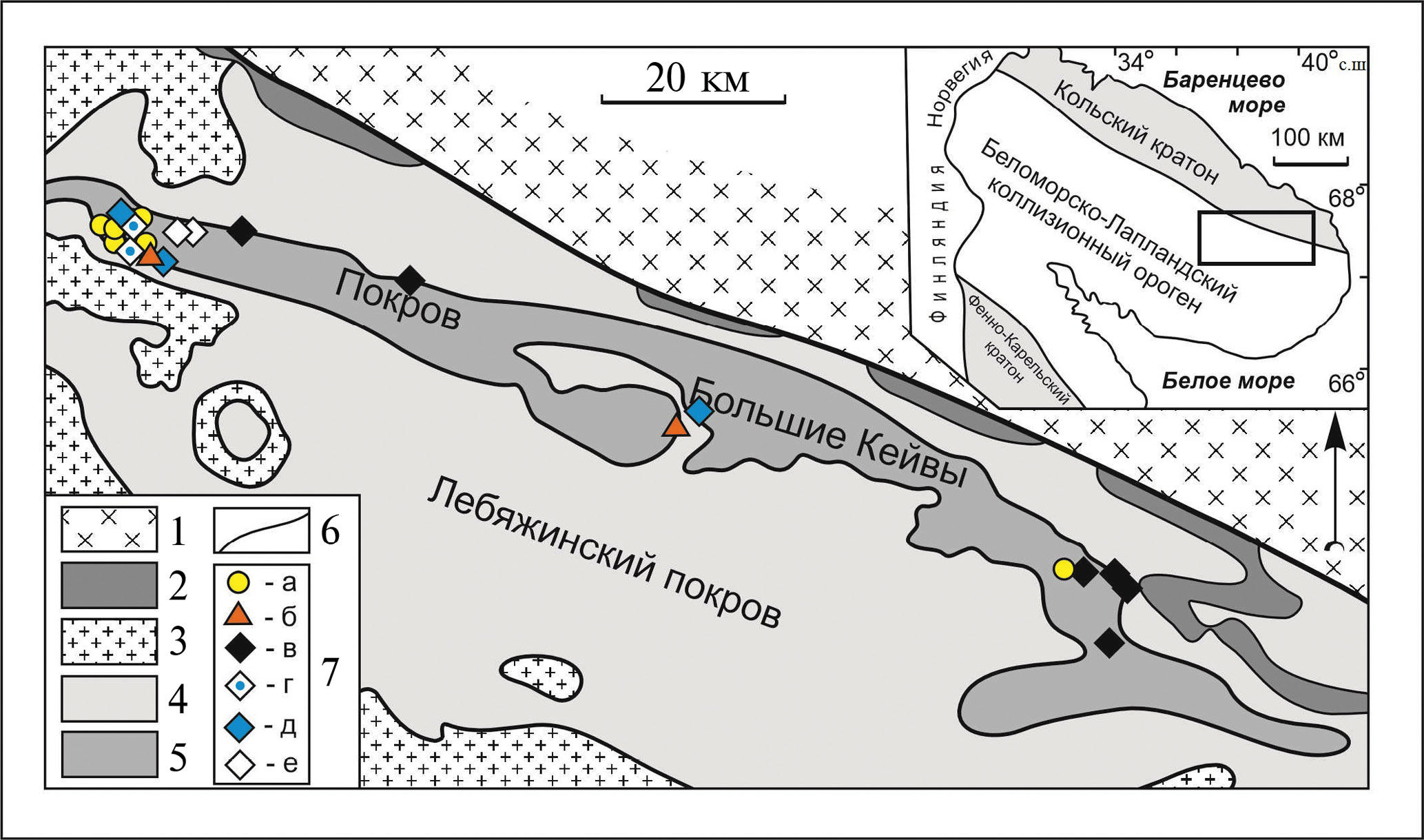 Рис. 1. Схема покровных структур северной части Кейвского террейна, (Бушмин и др., 2011а), с изменениями. 1 – граниты, гранито-гнейсы и гнейсы Кольского кратона, 2 – анортозиты, 3 – щелочные граниты, 4 – гранат-биотитовые и гранат-амфибол-биотитовые гнейсы с телами амфиболитов, щелочные метасоматиты, 5 – высокоглиноземистые метаморфические и метасоматические породы с телами амфиболитов и плагиоклазитов (метаанортозитов), 6 – тектонические границы по надвигам, 7 – цветными знаками показаны места отбора образцов разных типов пород. Тип-1: а – метаморфические гнейсы и сланцы с графитом; б – амфиболиты; тип-2: в – метасоматические кварцевые породы с повышенным содержанием графита; тип-3: г – кианит-кварцевые жилы с околожильными метасоматитами; тип-4: д – метасоматические кианитовые породы; тип-5: е – анхимономинеральные кварцевые жилы. На врезке показано положение района исследований.