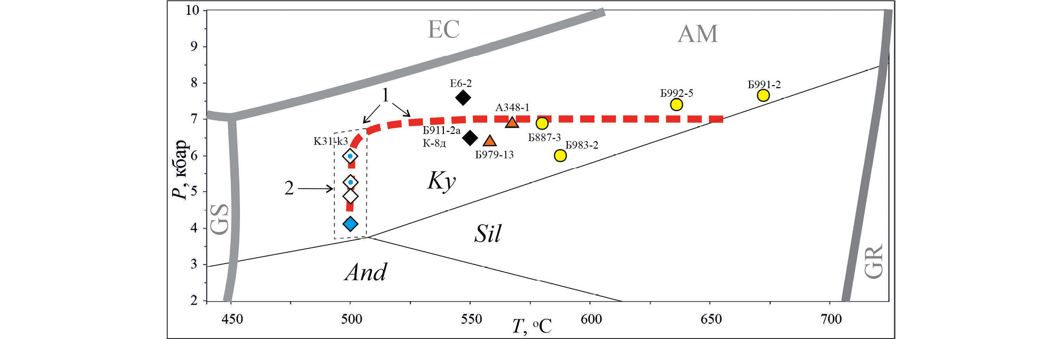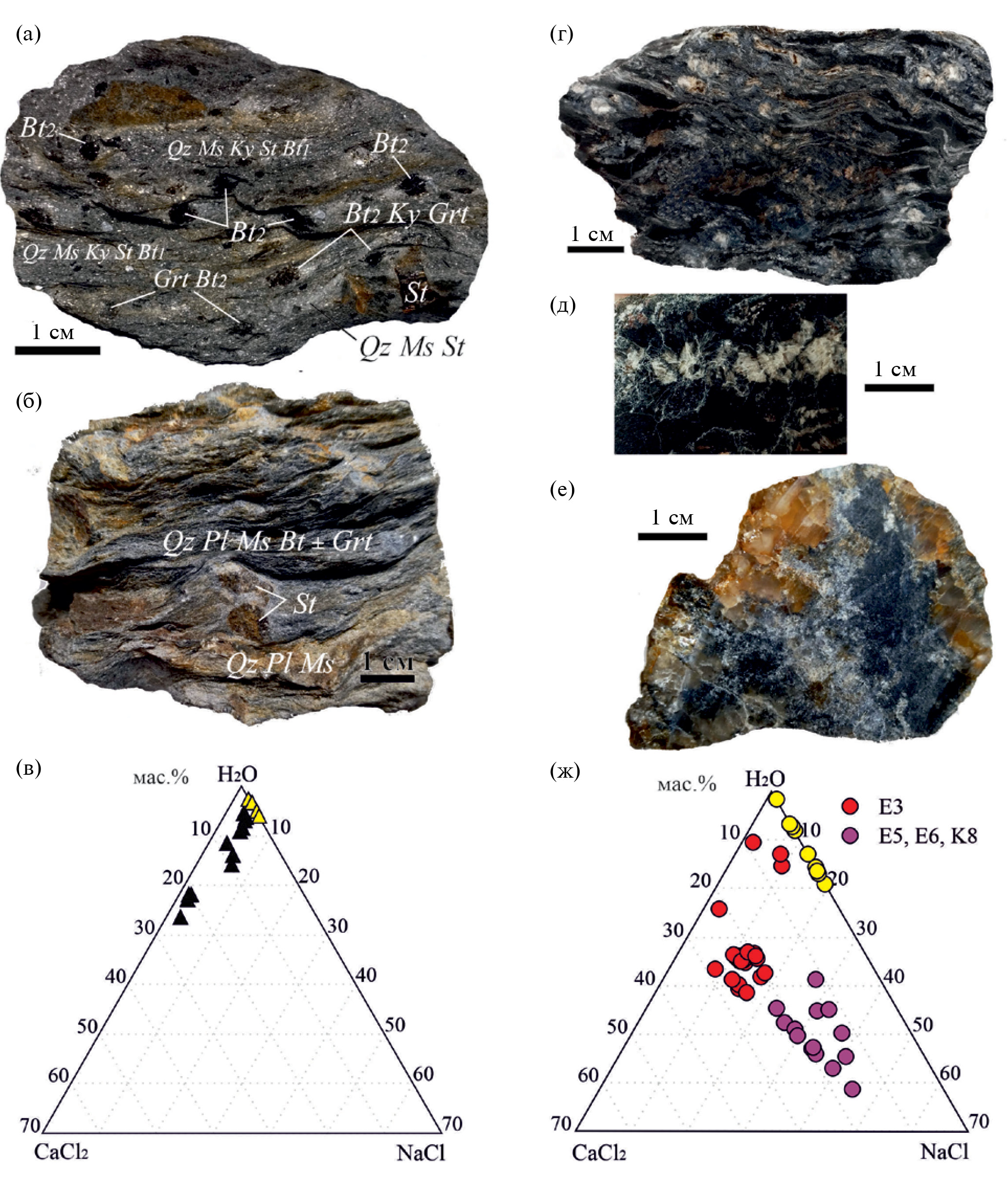 Исследованы образцы сланцев с ассоциациями: Qz + Pl30–48 + St14–17 + Ky + Bt44–5239–40 + Ms15–20 ± ± Grt8–136–12, Qz + Pl22–24 + St22–23 + Ky + Chl64–66 + + Bt58–6338–39 + Ms18–22 ± Grt13–144–5, Qz + Pl39–41 + + Ky + Chl65 + Bt53–5539 ± Grt11–14. Здесь и далее по тексту особенности химического состава минералов отражены в индексах: XMg для граната, биотита, ставролита, хлорита и XNa для мусковита и плагиоклаза указаны в подстрочных индексах; XCa для граната и XAl для биотита указаны в надстрочных индексах.