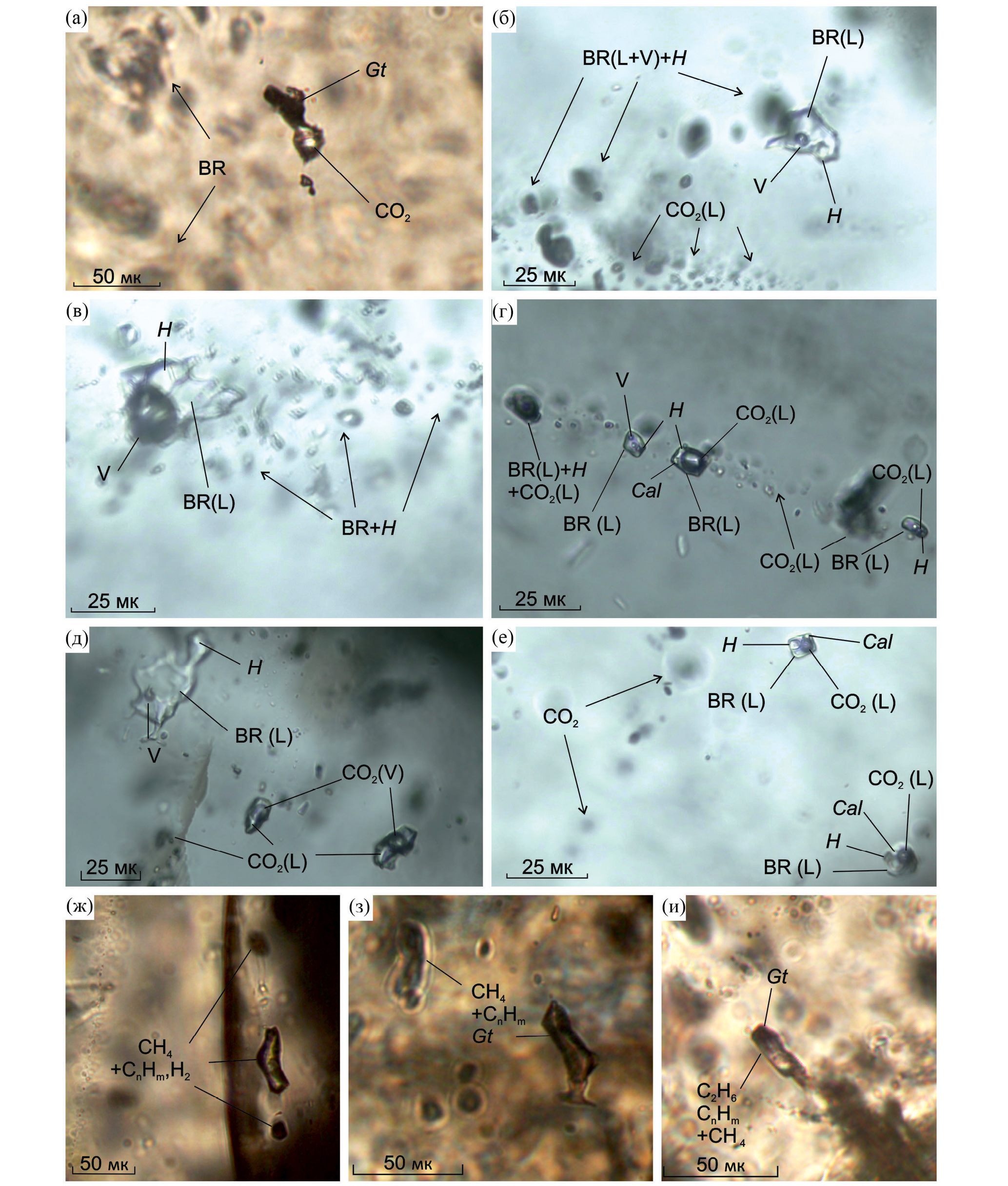 По составу выделялись существенно водно-солевые (включения рассолов) и существенно газовые включения. Идентификация твердых и газовых фаз (CO2, N2, CH4, C2H6 и более тяжелые углеводороды, H2) во включениях проводилась методом рамановской спектроскопии (микроскоп Olympus BX43 с рамановским спектральным анализатором РамМикс М532/785, ИГГД РАН, Санкт-Петербург). Определение температур фазовых переходов во флюидных включениях при нагревании после замораживания выполнено методом микротермометрии (микроскоп Olympus BX51 c термокриометрическим модулем Linkam THMSG600, ИГГД РАН). Измерения температур контролировались стандартами включений известного состава (Н2О 0°C; СО2 56.6°C; СН4 82°C; N2 147°C). Когда температуры плавления СО2 включений были занижены, предполагалось присутствие азота либо метана во включениях, что проверялось методом рамановской спектроскопии. Гомогенизация включений СО2 наблюдалась в жидкой и газовой фазах. Плотность включений СО2 определялась по температуре гомогенизации СО2 (ThCO2).