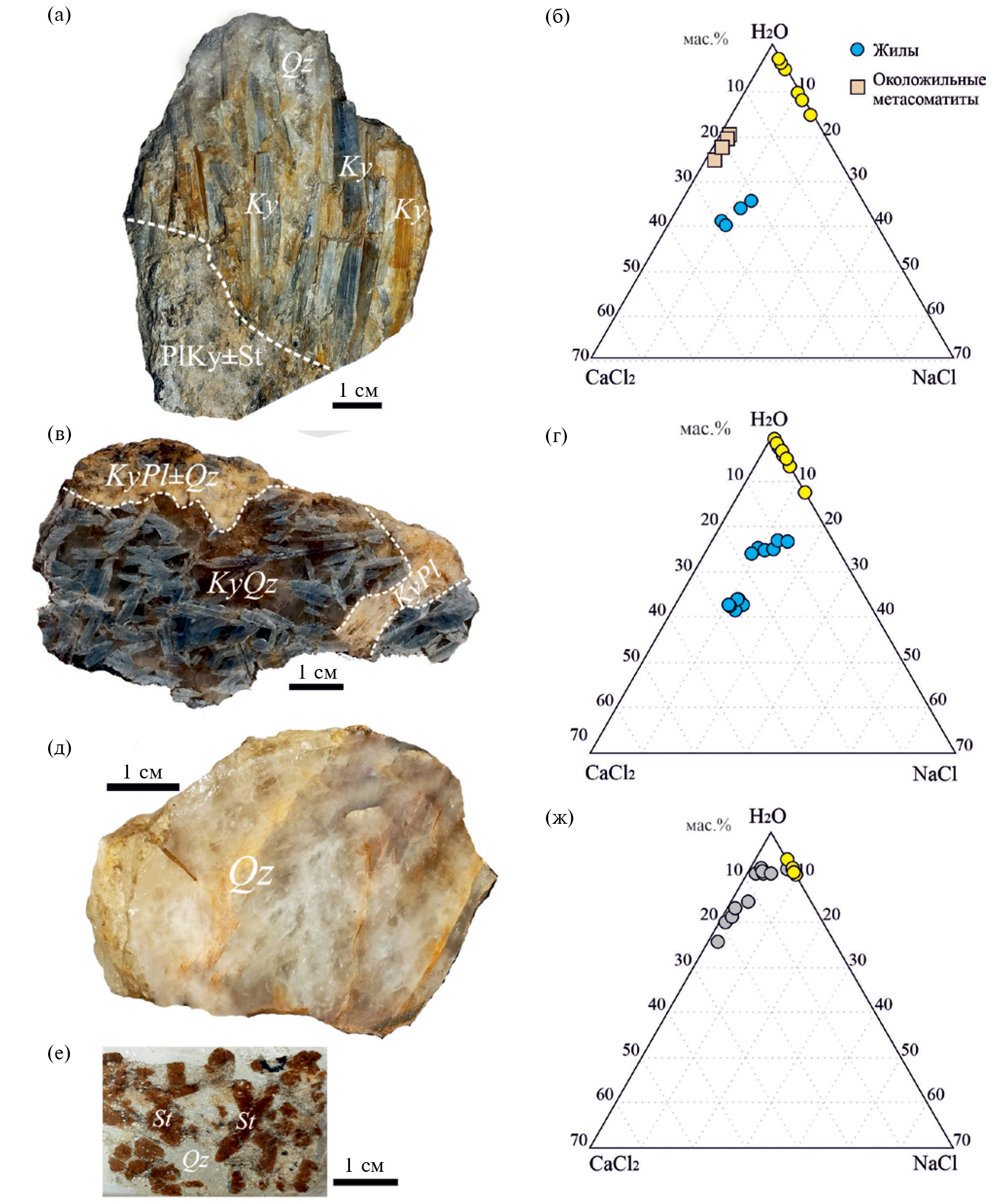 Многочисленные кварцевые жилы мощностью от десятков сантиметров до первых метров, содержащие скопления кианита, распространены во всем покрове, но чаще встречаются в его северо-западной части. Жилы пересекают сланцеватость и полосчатость в пластинах окружающих метаморфических и метасоматических пород под различными углами. Их отличительной особенностью от других кварцевых жил является присутствие околожильных метасоматитов с характерной минеральной зональностью. Например, в одном случае (обр. Б880, жила 1–2 м) первой околожильной зоной является крупнозернистая кварц-кианитовая порода, в которой кристаллы голубого кианита шириной не больше 1 см и длиной 7–8 см врастают от контакта вглубь кварцевой жилы. Следующей удаленной зоной от контакта является массивная ±Qz-Pl-Ky порода. Еще дальше от контакта в сторону вмещающего слюдисто-ставролитового метаморфического гнейса в этой ассоциации появляется ставролит как в виде отдельных зерен, так и в виде их скоплений. В ином случае (обр. Б884) жила (всего первые десятки сантиметров) содержит больше кианита и имеет первую околожильную зону шириной 20–30 см, сложенную длиннопризматическими кристаллами кианита длиной от 5 до 10 см, которые растут перпендикулярно контакту вглубь жилы, при этом их ориентировка продолжает направление сланцеватости вмещающей полосчатой бластомилонитовой метасоматической породы. Общей чертой всех околожильных метасоматитов является их массивное, неравномернозернистое строение, присутствие порфиробластов реликтовых минералов. Особенности состава минералов, присутствующих в околожильных метасоматитах: Qz, Ky, Pl21–35, St17–23, Ms21–27, Bt58–6237–41.