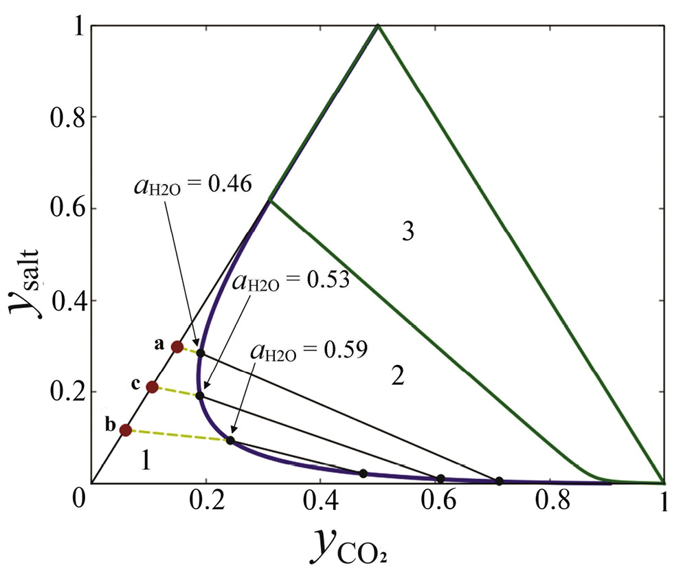 - yH2O= 0.522, yCO2 = 0.391, yNaCl = 0.072, yCaCl2 = 0.016, T = 470°C, P = 2 кбар.