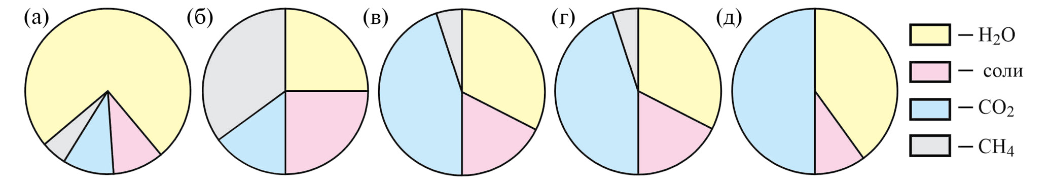 На рис. 12а представлена фазовая диаграмма для пород типа-1. Максимальная величина xsalt в этих породах очень близка к мольной доле соли в водно-солевой части флюида с составом, соответствующим критической точке сольвуса. Однако такого сорта флюиды должны также содержать большое количество углекислого газа (не менее yCO2 = 0.3), но включения СО2 редки. Таким образом, метаморфогенный флюид пород типа-1 был гомогенным, существенно водным и малосоленым.