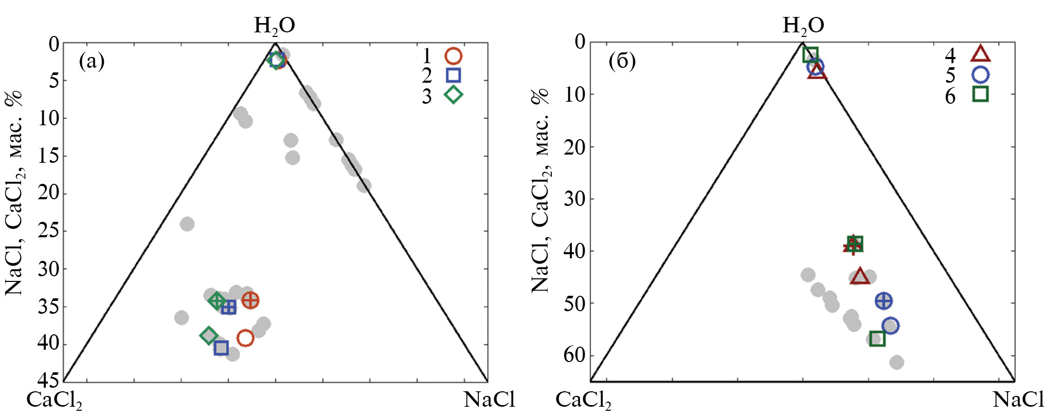 Рис. 10. Включения в породах типа-2. Серые кружки – водно-солевые составы исследованных флюидных включений в обр. Е3 (а) и Е5, Е6, К8 (б). Цветные символы – составы флюидов исходных включений и соответствующие им составы расслоенных флюидов. Точки, соответствующие составам флюидов исходных включений дополнительно отмечены знаком + того же цвета. Составы модельных флюидов исходных включений (y – мольные доли компонентов в четверной системе H2O-NaCl-CaCl2-CO2), Р-Т параметры, при которых произошло фазовое расслоение: