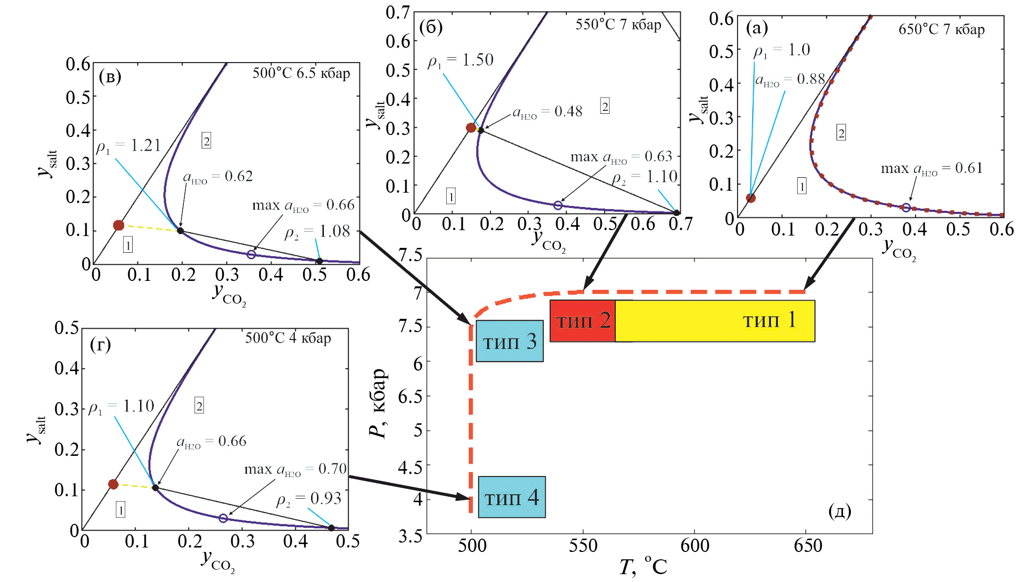 Рис. 12. Фазовые диаграммы флюидов вдоль обобщенного Р-Т тренда ретроградного изменения условий образования исследованных типов метаморфических и метасоматических пород покрова Большие Кейвы. (а) – тип-1, (б) – тип-2, (в) – тип-3, (г) – тип-4, (д) – прерывистая красная линия – обобщенный Р-Т тренд. Жирные синие линии – сольвусы. Обозначения фазовых полей – см. подпись к рис. 8. Незалитые кружки – критические точки сольвусов, в которых активность воды достигает максимального значения, возможного в области гетерогенного флюида. Красные кружки – максимальные мольные доли соли в водно-солевой части флюида для каждого из типов пород. Пунктирная красная линия на рисунке (а) – сольвус для P-T условий пород типа-2. аН2О – активность воды, ρ – плотность флюидных фаз (г/см3).