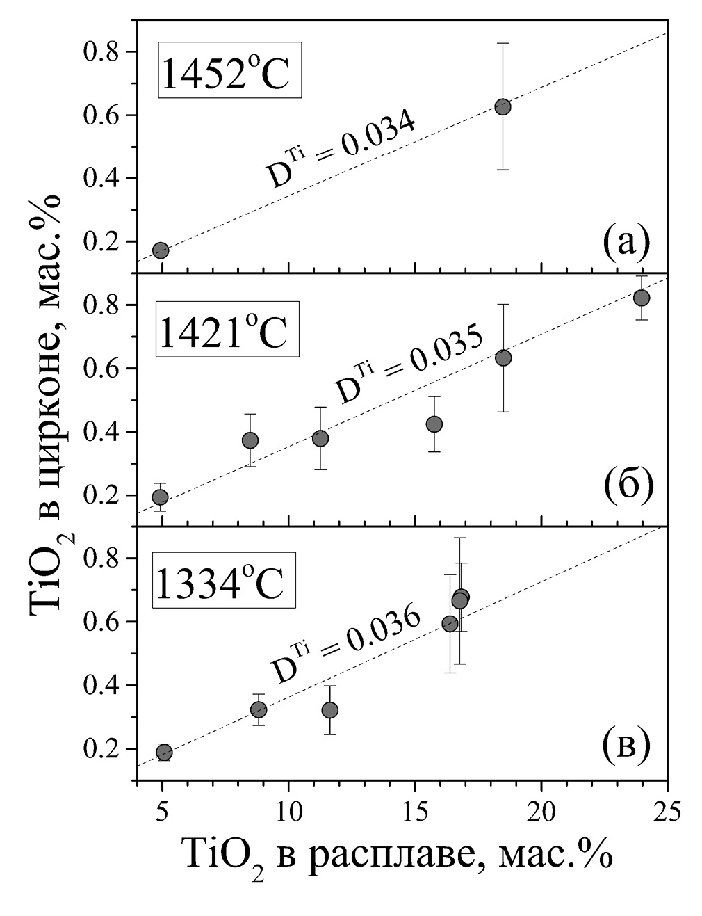 Сведения о коэффициенте распределения титана между цирконом и силикатным расплавом (DTi) противоречивы. Так, в работе (Thomas et al., 2002) проанализированы на ионном зонде расплавные включения в цирконах из грубозернистых кварц-биотит-роговообманковых диоритов и рассчитаны значения DTi, оказавшиеся необычайно высокими (3.2–16.8). В свою очередь, (Luo, Ayerst, 2009) выполнили эксперименты по распределению редких и малых элементов (в том числе Ti) между цирконом и водосодержащим высокощелочным риолитовым расплавом и рассчитали DTi = 0.5–3.8. Наконец, (Hofmann et al., 2013) в опытах при 1200–1400°C показали, что DTi заведомо ниже единицы и практически не зависит от температуры.
