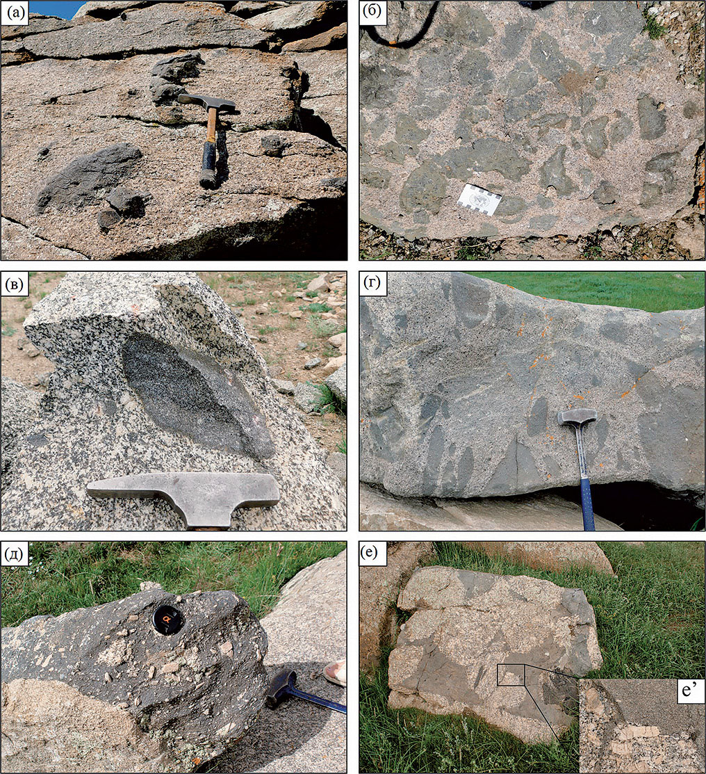 Рис. 6. Мафические включения в гранитоидах Хангайского батолита: (а) – отдельные сложной морфологии базальтовые включения в кварцевых сиенитах; (б) – рой базитовых включений с темными зонами закалки в кварцевых сиенитах; (в) – разрозненные базитовые включения с зоной закалки в меланократовых гранодиоритах; (г) – зона гибридизации, насыщенная гибридизированными мафическими включениями и диспергированным мафическим материалом; (д) – базитовое включение «импрегнированное» калиевым полевым шпатом; (е) – неправильная «ксеноморфная» морфология базитовых включений в гранодиоритах; (е’) – увеличенный фрагмент: крупный кристалл Kfs (в центре рисунка) прорастает внутри мафического включения, что указывает на полукристаллическое состояние ММЕ (Barbarin, 2005).