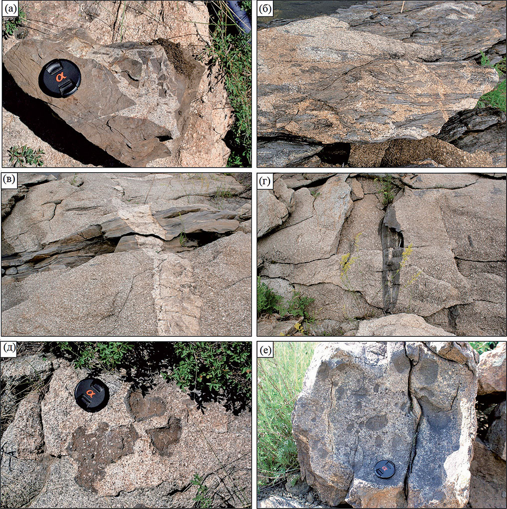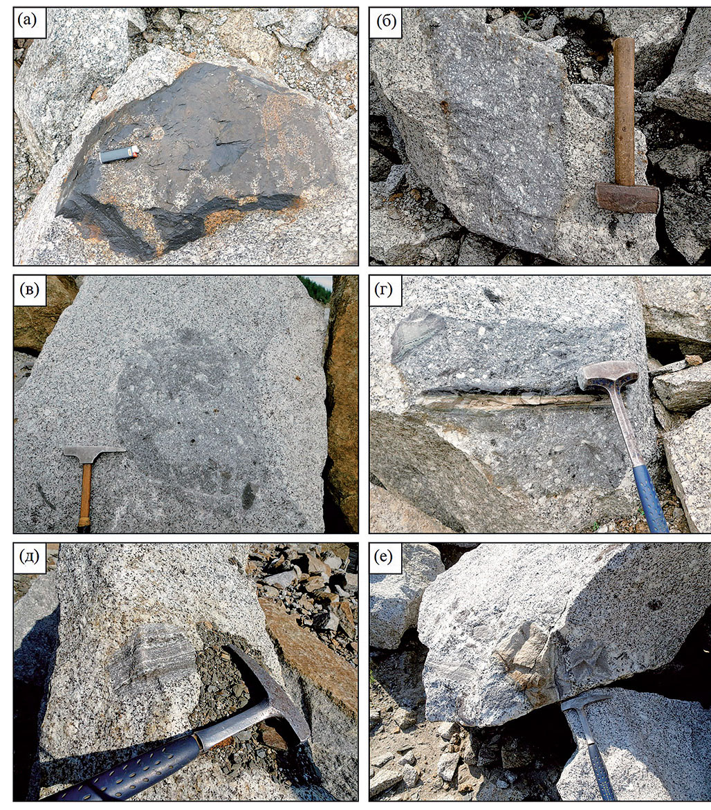 Рис. 8. Ксенолиты глинистых сланцев и мафические включения в гранитоидах Калбо-Нарымского батолита: (а) – раздробленные ксенолиты ороговикованных глинистых сланцев в граносиенитах массива Тастау; (б–г) – дезинтегрированные кленолиты глинистых сланцев в гранитах калбинского комплекса; (в) – удлиненный ксенолит глинистых сланцев в калбинских гранитах, секущихся пегматитовой жилой; (д) – включения базальтов в граносиенитах массива Тастау; (е) – гибридные меланократовые кварцевые диориты с мафическими включениями разного состава в Преображенском массиве.