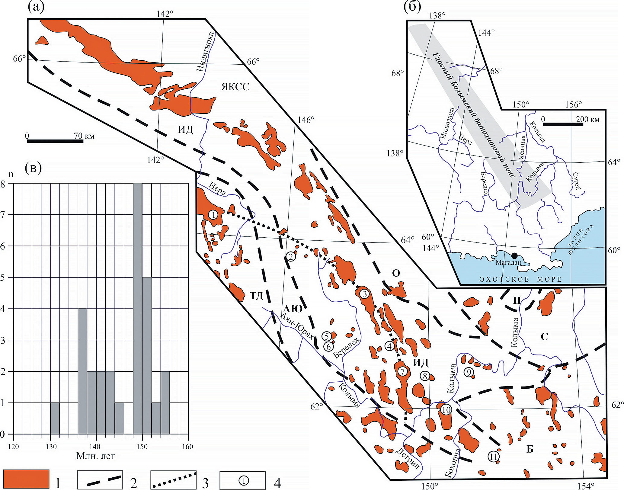 Рис. 9. Схема размещения гранитоидных плутонов Главного Колымского батолитового пояса (а) и географическое расположение батолитового пояса (б), по (Русакова, Котляр, 2003) с изменениями; (в) – гистограмма U-Pb возрастов гранитоидов Главного Колымского батолитового пояса (составлена на основе публикаций (Акинин и др., 2009; Герцева и др., 2021) и неопубликованные данные авторов).