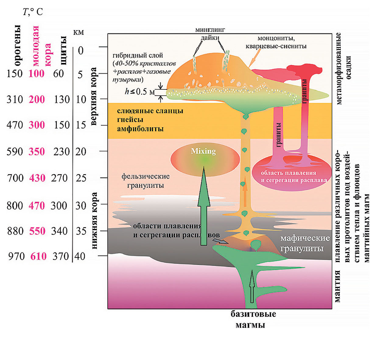 Large granitoid provinces can be divided into areal and linear types, which differ significantly in the area and volume of granitoids in their composition. It is shown using the example of the largest granitoid provinces of Central and Northeast Asia (Angara-Vitim, Khangai, Kalba-Narym, Kolyma). It is assumed that these differences are due to the structure of pregranitic basement and degree of thermal impact on the lower and middle continental crust. An important factor in the formation of granitoid provinces is mantle mafic magmatism, the estimated scale of which correlates with the volumetric and areal characteristics of the granitoid provinces. The role of mafic magmatism is an additional input of heat from the fluids into the melting region of crustal protoliths, as well as a material contribution that is realized through various mechanisms of magma mixing. Mixing at the deep level is the most effective, resulting in the formation of significant volumes of increased basicity salic magmas. The petrogenetic role of contrasting magmas mixing at the mesoabyssal level of the earth's crust, as well as in hypabyssal conditions (mingling dikes), is not great, but these manifestations are the key argument in justifying the synchronicity of mafic and granitoid magmatism. Granitoids of Silicic Large Igneous Provinces (SLIPs) are characterized by a heterogeneous isotopic composition, generally corresponding to the parameters of the continental crust. The extremely high heterogeneity of spatially conjugate granitoids due to the mixing of silicic magmas formed through the melting of a small number of sources with contrasting isotopic compositions, including through mixing with magmas of mantle origin. Mafic rocks included in the granitoid provinces correspond to the isotopic composition of the enriched mantle (Angara-Vitim batholith) or indicate a significant contribution of contamination with continental crust material (Khangai area). The metallogeny of SLIPs is determined by the erosional section size and the crustal protoliths type, the metamorphism degree of which largely determines the initial fluid content of silicic magmas. The melting of highly metamorphosed ancient crustal protoliths produces relatively “dry” silicic melts, the melting of low-metamorphosed crustal sources leads to the formation of “aqueous” melts, the differentiation of which ends with pegmatite formation with rare metal mineralization. Non-subduction origin SLIPs formation is associated with the mantle plumes impact (in the form of synchronous basaltoid magmatism) on the heated crust of young orogenic regions, where tectonic processes ended no more than a few tens of Ma.