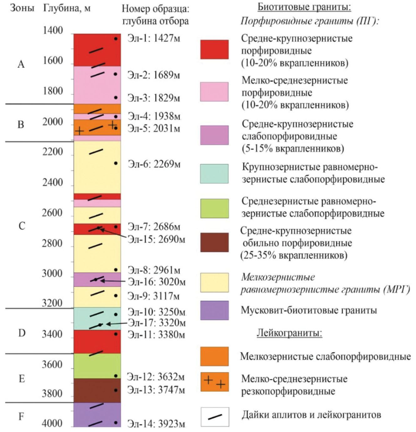а) Прикровельная зона (глубина <1857 м). За исключением маломощной апикальной зоны, породы в этом интервале наиболее однородны и представлены однообразными светлыми порфировидными крупно- и среднезернистыми биотитовыми гранитами, состоящими из КПШ, плагиоклаза, кварца и биотита. По сравнению с нижележащими гранитами, КПШ в породах зоны А заметно обогащены Ab-составляющей (до глубины 1100 м). Плагиоклазы отличаются появлением очень основных (до 64% An) составов в I генерации. На глубине 1688 м в ТГС фиксируется переход от мегапорфировидных (за счет крупных фенокристов KПШ) средне-крупнозернистых к мелко-среднезернистым порфировидным биотитовым гранитам. В последних несколько увеличивается количество биотита (до 13–15% по сравнению с 8–10% в крупнозернистых гранитах). В нижней части интервала граниты приобретают мелкозернистую и резкопорфировидную структуру. Отобраны образцы биотитовых гранитов (Эл-1 … Эл-3);
