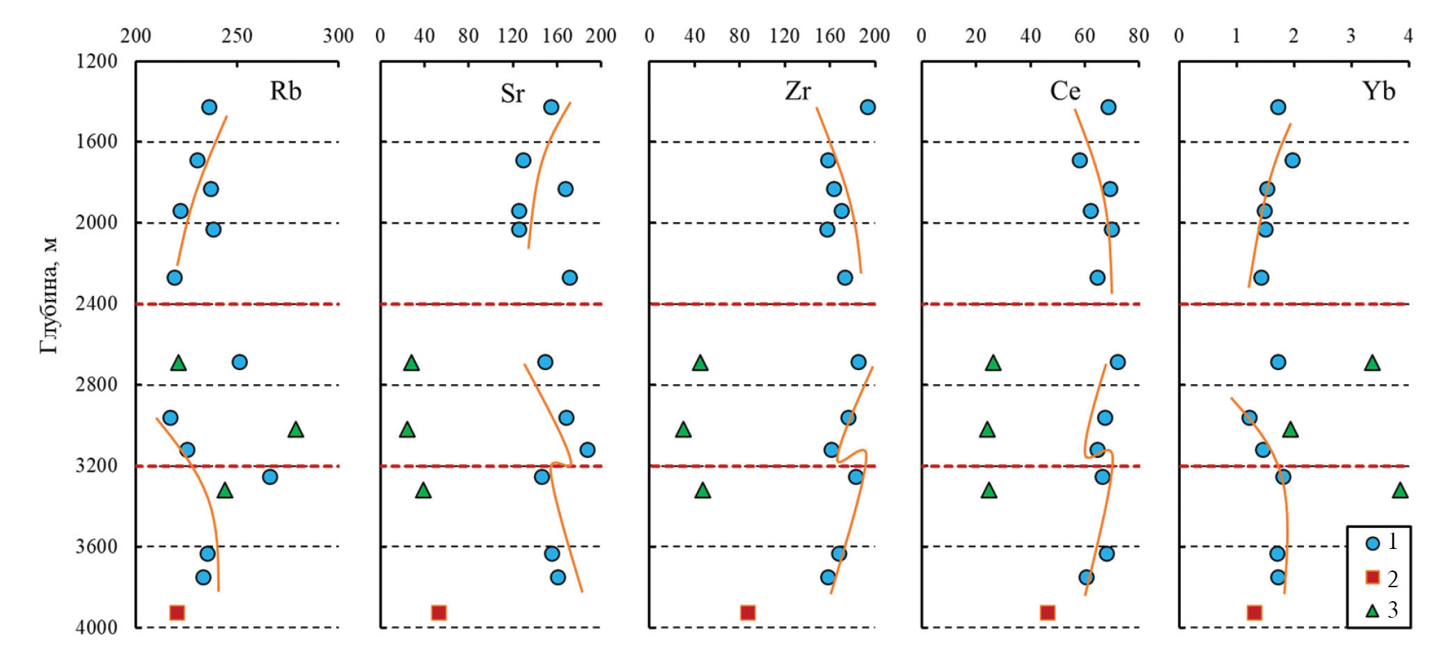 Полученные Тс закономерно связаны с положением образца в вертикальном разрезе массива (рис. 12б). Более высокие Тс, как и более высокие скорости остывания, приурочены к верхней части разреза. Это вполне объяснимо, поскольку породы, находящиеся в кровле массива, остывают быстрее из-за большего градиента температуры между горячей породой и окружающей средой. Однако для Эльджуртинского массива, скорее, наблюдается разбиение оценок на две группы – для образцов из верхней и нижней частей массива. Граница между этими двумя группами пород находится на уровне 2800–3000 м, где расположена нижняя часть зоны со следами слабых гидротермальных изменений (рис. 2). Граниты верхней части массива имеют в целом более высокие скорости остывания, чем граниты из нижней части (обр. Эл-10, Эл-12). Оценки скоростей остывания для последних низкие – менее 10 град./млн лет и являются маловероятными даже при расчете по уравнению диффузии в гидротермальных условиях (Dennis, 1984). Различие в скоростях остывания верхней и нижней частей Эльджуртинского массива корреспондируется с различиями в трендах изменения концентраций микроэлементов в вертикальном разрезе (рис. 7). Зона, в которой происходят изменения трендов на противоположные, располагается на глубине 2800–3200 м (рис. 7), т.е. совпадает с границей пород с разной скоростью остывания: обр. Эл-3, Эл-4 находятся в верхней части зоны, обр. Эл-10, Эл-12 – в нижней, обр. Эл-7 попадает в область перехода (излома трендов и скачков концентраций) (рис. 7, 12б).