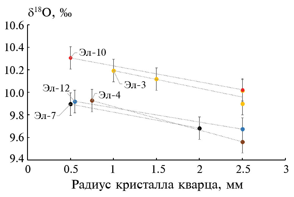 Для обр. Эл-4 наблюдается разброс значений Тс, который не компенсируется разницей в размерах минеральных зерен (рис. 12а, 12б). Возможно, что кварц в этом образце испытывал частичное открытие изотопной системы кислорода, вероятнее всего в зерне большего размера. Это наблюдение согласуется с положением обр. Эл-4 в разрезе массива – он приурочен к зоне, в которой наблюдаются следы гидротермальных изменений (Докучаев, Носова, 1994).