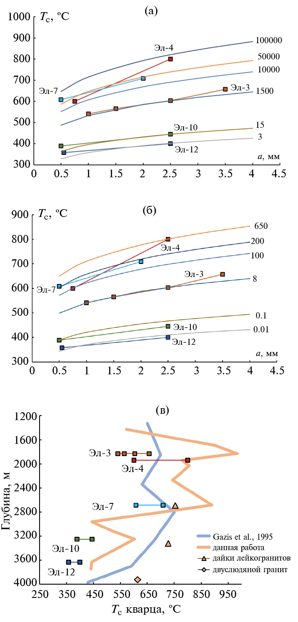 На рис. 12а, 12б показаны расчеты для двух крайних случаев – диффузии кислорода в кварце в гидротермальных (D0 = 2.09Е-11 м2/с, Eакт = 138.54 кДж/моль, Dennis, 1984) и в “сухих” условиях (D0 = 2.1Е-12 м2/с, Eакт = 159 кДж/моль, Sharp et al., 1991). Видно, что выбор уравнения диффузии играет определяющую роль при оценке абсолютного значения скорости остывания, и результаты могут различаться на порядки, не только если учитывать присутствие воды в системе (Kohn, 1999; Farver, 2010), но и ориентировку кристалла (Dennis, 1984, обзоры в Farver, 2010; Valley, 2001 и др.). Например, оценки скорости остывания для обр. Эл-3 могут составить как 1500, так и 8 град./млн лет, в зависимости от выбора условий диффузии и конкретного уравнения. Эти оценки являются почти идеальными: в обоих случаях три точки из четырех в обр. Эл-3 расположены на одной изолинии скоростей остывания. Остальные образцы тоже показывают значения Тс, которые в пределах образца соответствуют близким скоростям остывания. Однако абсолютные величины скорости остывания, установленные для разных образцов, различаются на порядки: от первых градусов до первых десятков тысяч градусов за млн лет при расчете по уравнению диффузии в гидротермальных условиях (Dennis, 1984) и от сотых долей градуса до первых сотен градусов за миллион лет при расчете по уравнению диффузии в “сухих” условиях (Sharp et al., 1991). Последний вариант выглядит более реалистичным, и часть полученных оценок близка к интервалу 200–500 град./млн лет, установленному по поведению изотопной системы аргона в биотите (Gazis et al., 1995). Это соответствие указывает на остывание гранитов Эльджуртинского массива в условиях низкой активности воды. Поскольку выбор уравнения диффузии кислорода в кварце (Dennis, 1984; Freer, Dennis, 1982; Farver, Yund, 1982; Sharp et al., 1991) сильно влияет на определение скорости остывания, для дальнейших исследований желательно иметь независимую оценку возможного присутствия значительного количества водного флюида в системе.